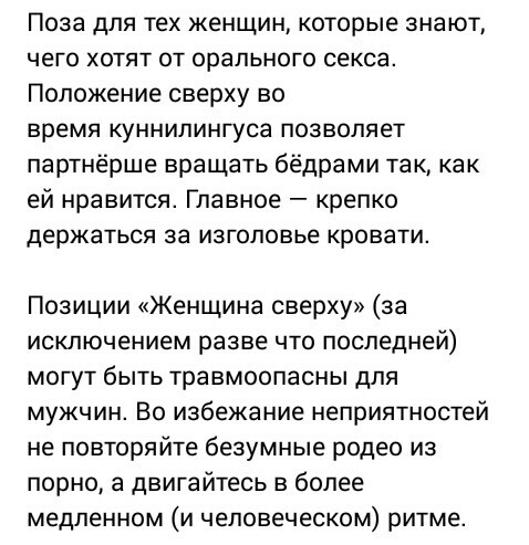 Преимущество этой позиции — отличный вид для партнёра. Женщина же может наклоняться вперёд или назад, чтобы менять угол проникновения или найти самое удобное и приятное положение.
