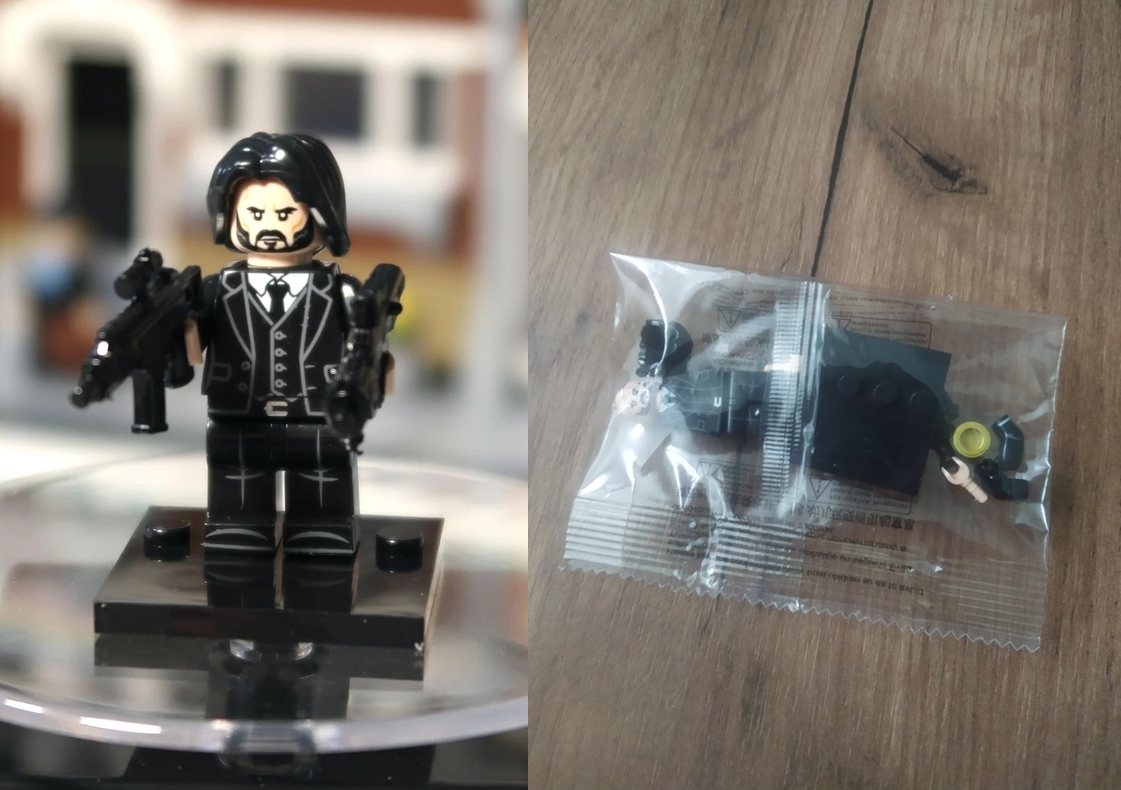 Мини фигурка для сборки Джона Уика (Киану Ривза) из пластиковых деталей похожих на Lego. Стоит 144 руб. Ссылка на фигурку
