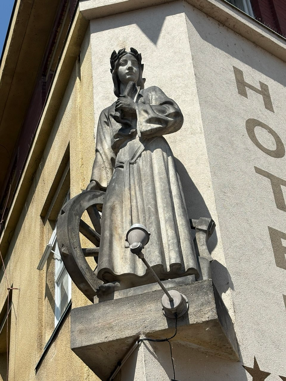Живет под куполом старого здания Пражского вокзала. И, как видите, совершенно никого и ничего не стесняется, а, скорее, даже хвастается. Благо, есть, чем. Поблагодарить за это стоит как архитектора вокзала Йозефа Фанту, так и скульпторов – Сухарда и Шалуна. Думаю, второго в первую очередь. Милфой я ее назвал не просто так, ведь надпись, на которую обращен ее взор, гласит «Прага – мать городов». Окруженная декором в стиле ар-нуво, она надменно воротит от входящего морду, и не знает еще своей гипсовой башкой, что ее Belle Époque подходит к концу, а земля под ее стопами (фееричными) уже трескается траншеями Первой Мировой. Любит быть сверху.