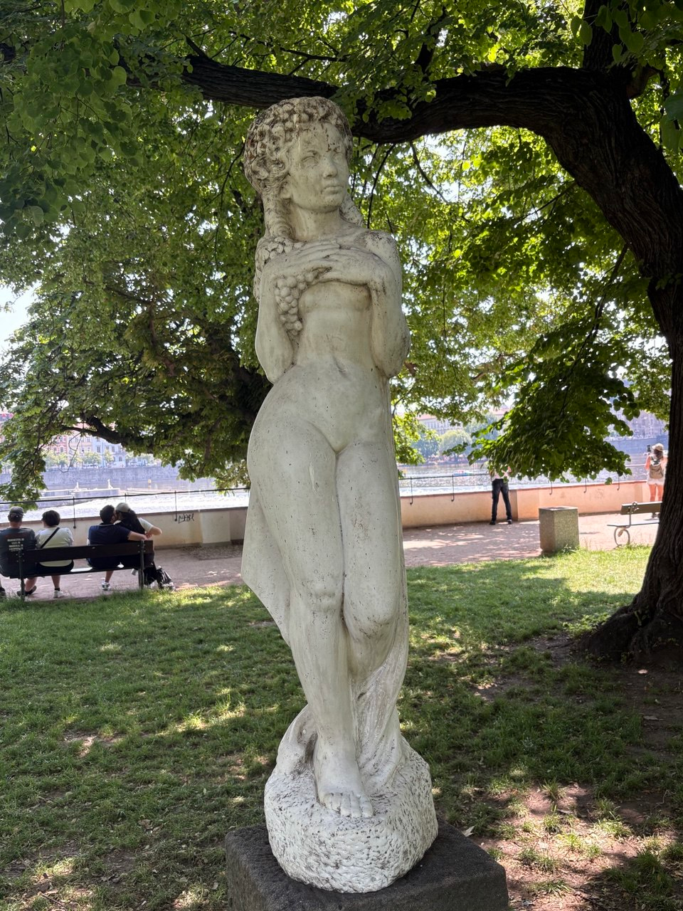 Ну или, как она называется официально - Dívka s hrozny — «Девушка с виноградом». Живет эта тянка в тени лип у самого берега Влтавы на острове Кампа. Росту в ней 160 см, а плоть ее – из чистейшего каррарского мрамора. Однако, годы на ней никак не сказались, она все такая же горячая (нагрелась под солнцем) и притворно-возмущенная, будто ты вломился к ней в душ, а она без халата. Этакая тонкая линия между притворной стеснительностью и вызовом. Создана она, кстати, не каким-нибудь хикканом с странными фантазиями, а Карлой Вобишовой-Жаковой, первой профессиональной женщиной-скульптором Чехословакии в 1960 году, так что 18 ей уже стукнуло, все легально.