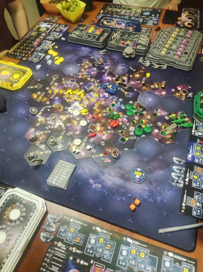 Отличная игра, каждая партия, что я провёл (пусть я и играю раз в год, и, как правило, не в свою коробку), проходит весело: в эклипсе прикольно развивать свою нацию, отыгрывать от её особенностей, как-то избирать пути прокачки. Строить толпу маленьких перехватчиков и с их помощью шатать вражеские неповоротливые и неинициативные эсминцы или, наоборот, развивать технологию гиперпространственных прыжков, что позволит тебе перемещаться с одного конца галактики на другой и высаживать десант кораблей прям на родную систему ничего не подозревающего оппонента - все это в эклипсе есть и каждый раз партии проходят по какому-то иному лекалу и дарят тебе веселье. Но при этом достаточно серьёзная, комплексная 4x стратегия на 4, а то и на 6 человек проходит в приемлемые сроки, что в наше время, когда у тебя ограничено время, очень важно.