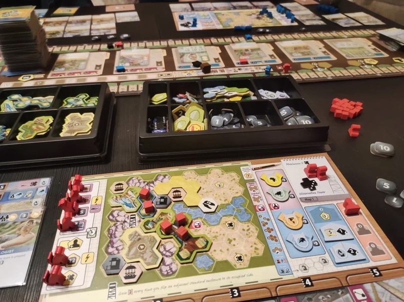 В отличие от часто противопоставляемой ему Дюне Империи, выбыл также из моего перечня любимых игр по многим причинам. Во-первых, он не стал играться дома. Во-вторых, в больших компаниях, как правило, мы играем вчетвером и вчетвером Арнак кажется не таким прикольным народу, а более кризисным и душным. В-третьих, Арнак более евровый, на мой взгляд, нежели Дюна, и на этом фоне он все чаще уходил на второй план. Наконец, на фоне хайпа многих игр (сами знаете, в последнее время это бич для современного настольщика, что, не сыграв в какую-то новую, выходящую, появившуюся на рынке игру ты рискуешь так никогда её и не сыграть, просто потому, что народ гонится перепробовать все новинки) и если какие-то игры продолжали появляться на столе, то Арнак конкуренции с новинками лично у меня не выдержал и немножко остался на задворках. Игра от этого, конечно, хуже не стала, появившийся доп сильно улучшил игру, ввёл асимметрию (да, конечно, там не обошлось без дикой разбалансировки персонажей), но игра стала заметно интереснее, приятнее. Это все ещё достаточно интересная, тактичная. Разнообразная стратегия, где, как водится, надо успевать все и вся, и в храм сходить (кстати, все ещё имба), и на монстров поохотиться, и карточки выгодные прикупить. Но в текущий момент он далеко не в приоритете.