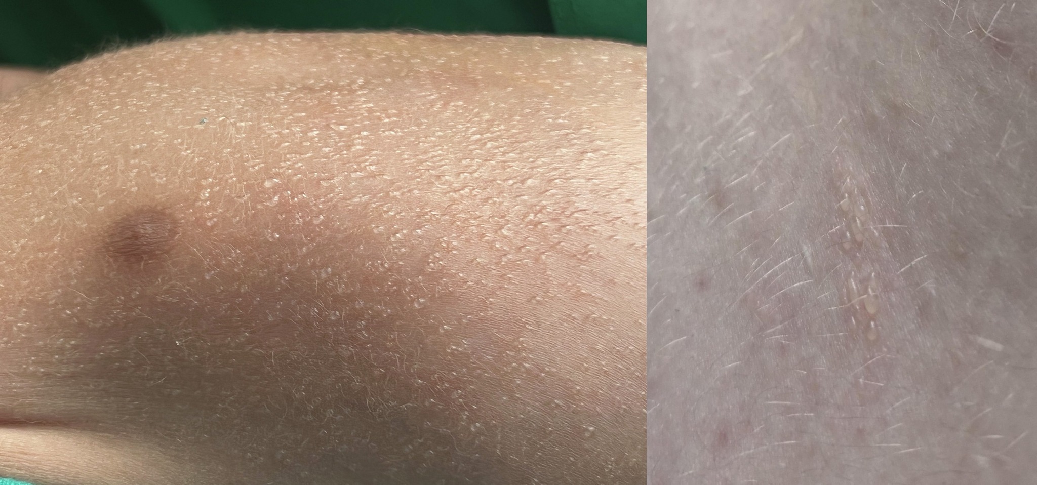 Закупорка протоков происходит в области дермо-эпидермальнго соединения или глубже. Из-за такого глубокого поражения высыпания выглядят как бугорки телесного цвета, напоминающие гусиную кожу.