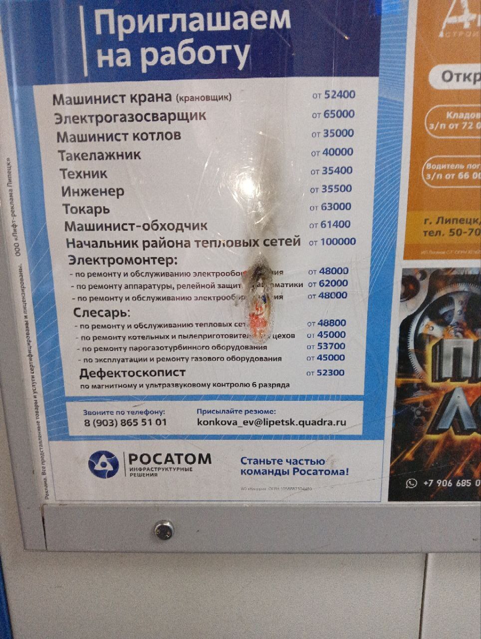 Сфотографировал сегодня в лифте. Заманчивые вакансии от росатома. Теперь понятно почему так взъелись на курьеров. Их зарплаты сильно наверное расстраивают инженеров атомной промышленности.