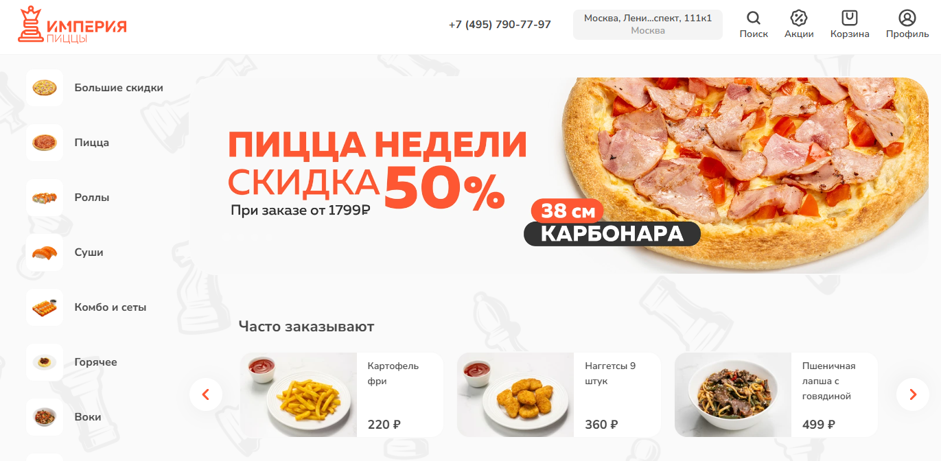 Империя Пиццы — круглосуточная доставка с минимальной суммой заказа и акциями на ночные заказы.