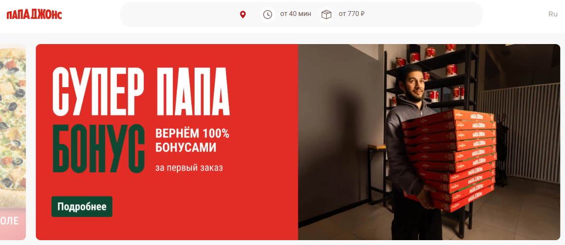Papa John's — работает до поздней ночи и предлагает выгодные промокоды и сеты.