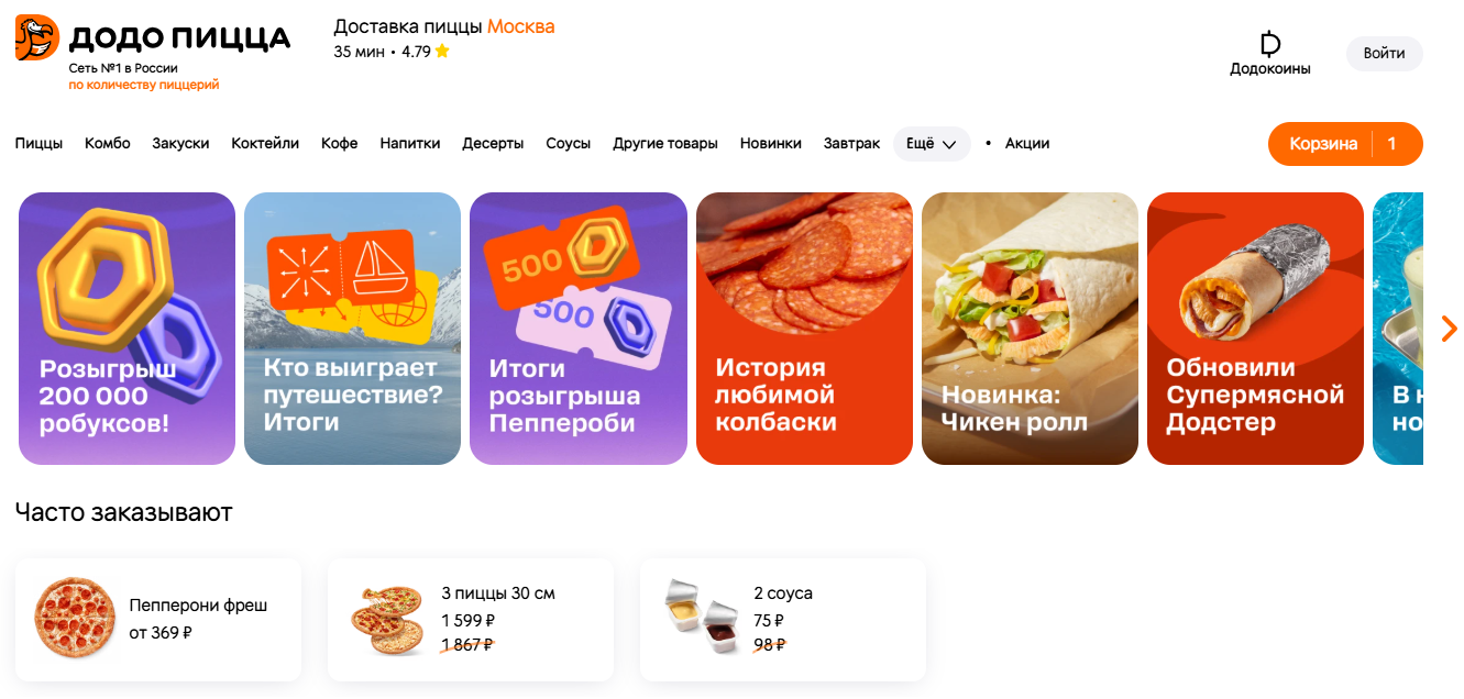 Додо Пицца — круглосуточная доставка во многих районах Москвы, быстрая обработка и собственная логистика.