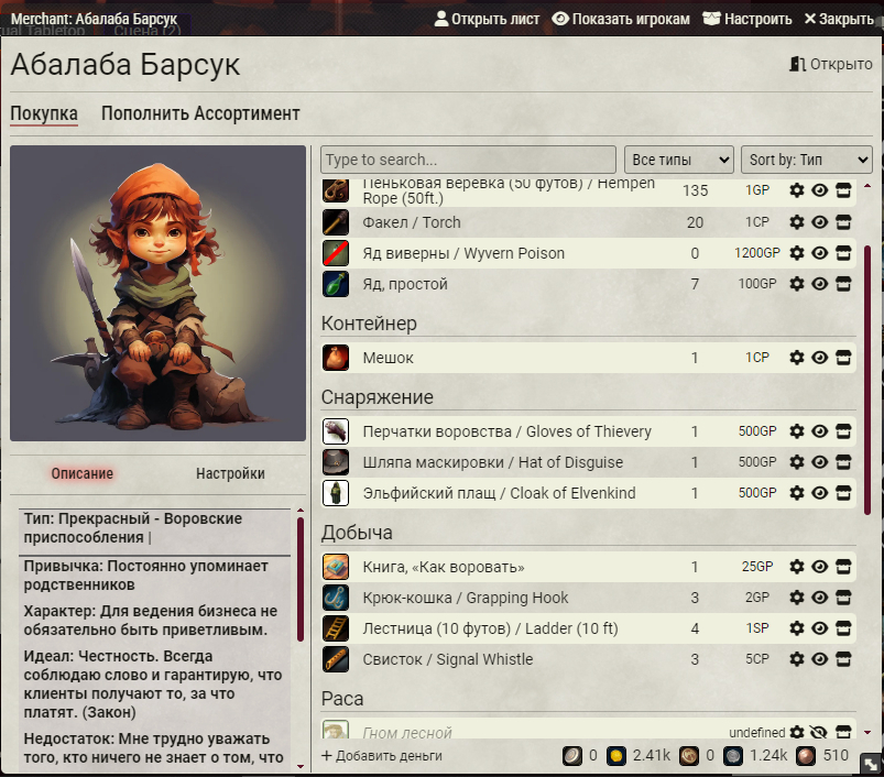 Торговец из пробирки это модуль который позволяет создавать торговцев для днд на лету.