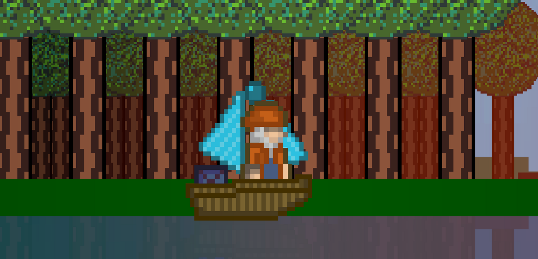 Скрипт торговли уже был готов. Мы нарисовали простенькую лодку и самого торговца в стилистике предыдущих мобов-людей. Затем расширили скрипт, добавив анимации приплытия и отплытия. Всё готово! Мелочь, а приятно!
