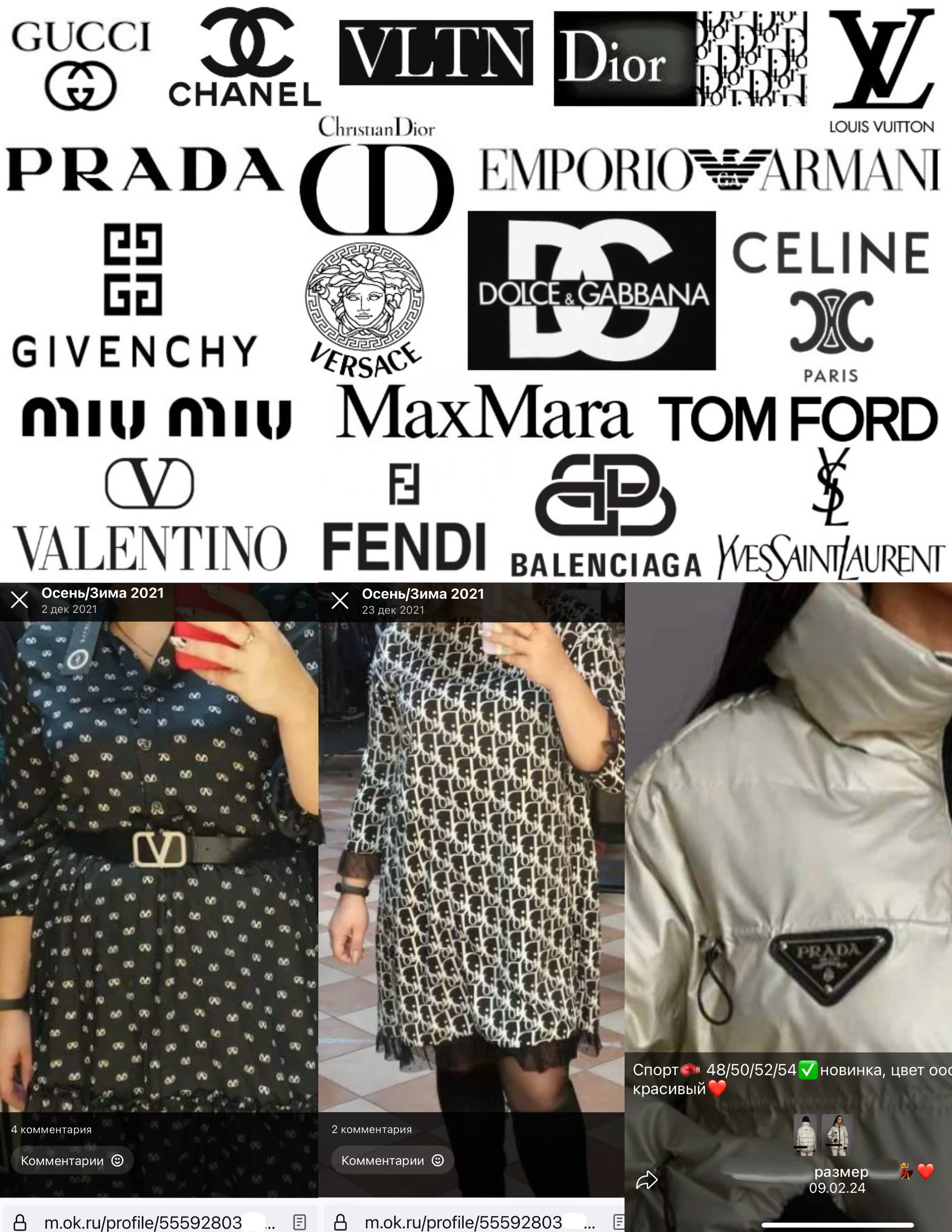 Сверху некоторые популярные люксовые фирмы и их логотипы. Дальше товары ИП от разных лет, все контрафакт. Тест на внимательность)