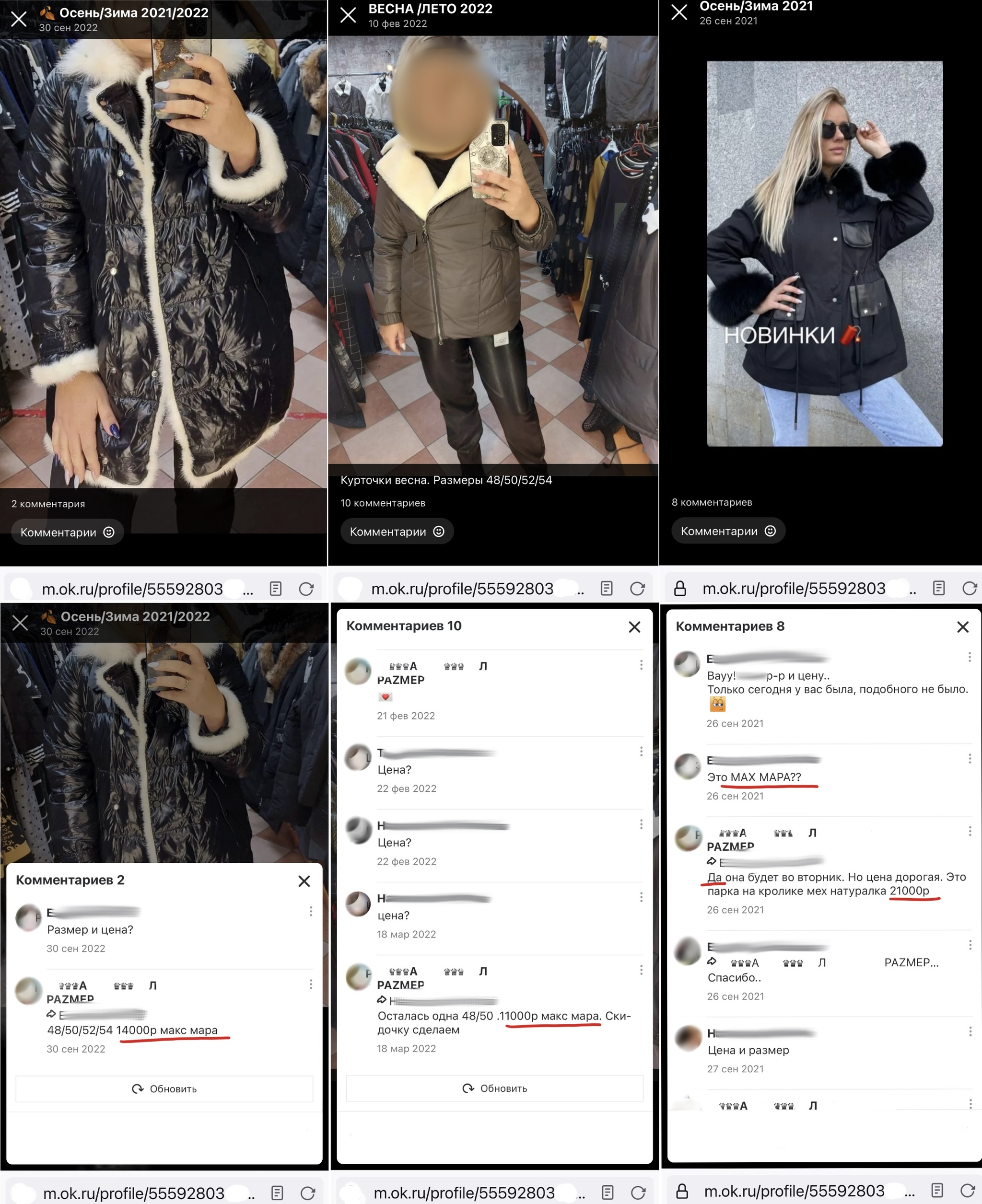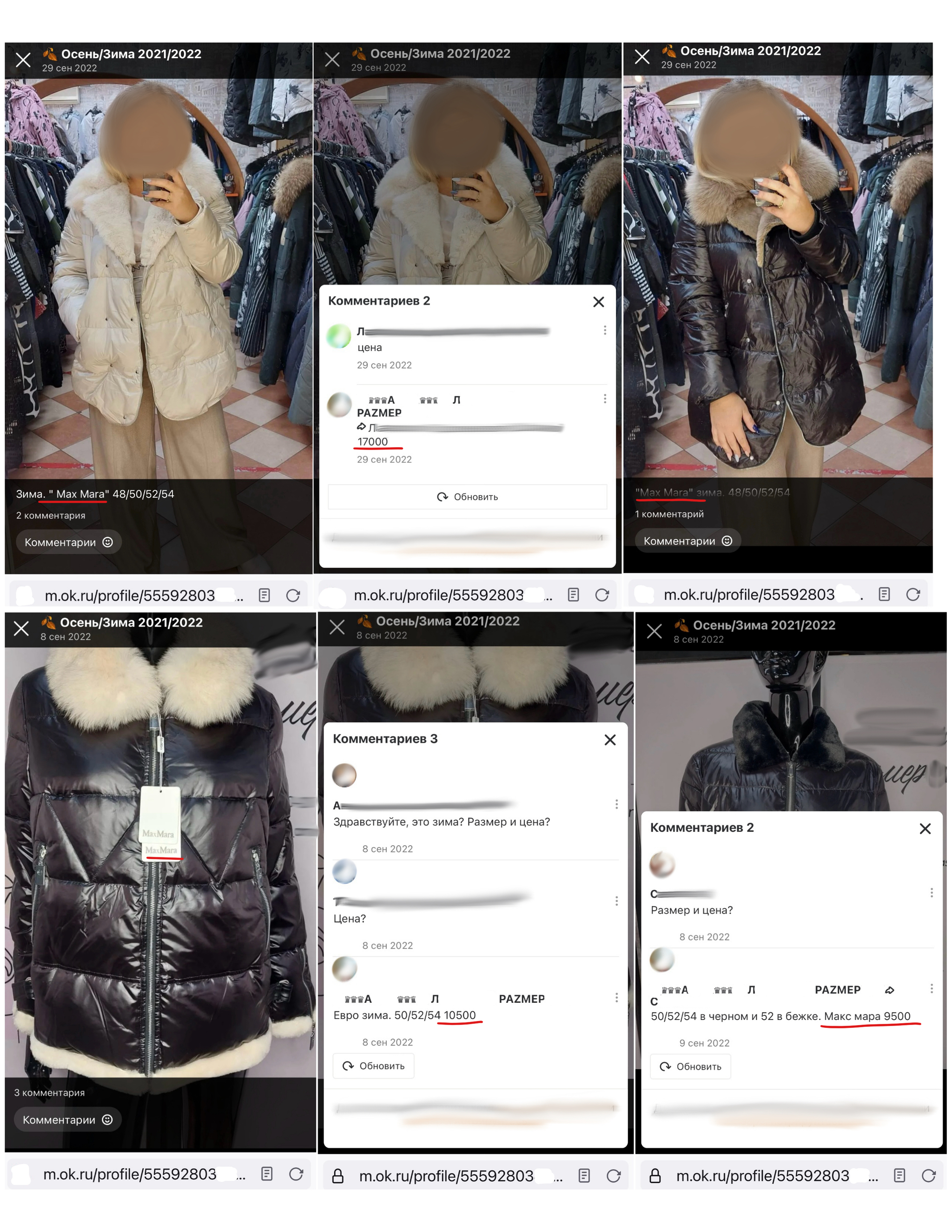 Стоимость зимних курток «MaxMara» с самыми большими скидками на распродаже ~ 35000 -125000 рублей. Только по разнице в цене можно сказать, что у ИП не оригинальная продукция. Мы легко нашли по картинкам идентичные куртки в разных регионах России, в Беларуси, Казахстане и т.д. только значительно дешевле. Какие-то с ярлыком других фирм, какие-то тоже «MaxMara». Из найденного в 2021 у меня уцелел единственный скрин (список ВК с ценами). Сейчас результаты совсем другие - время прошло и Япоиск по картинкам обновили. Неизменно одно - в 2021 году в магазине «Размер» продавали подделки, китайскую хрень с пришитой люксовой этикеткой. Так обманули минимум 18 человек. В связи с тем, что некоторые модели завозили повторно, точное количество посчитать нельзя.