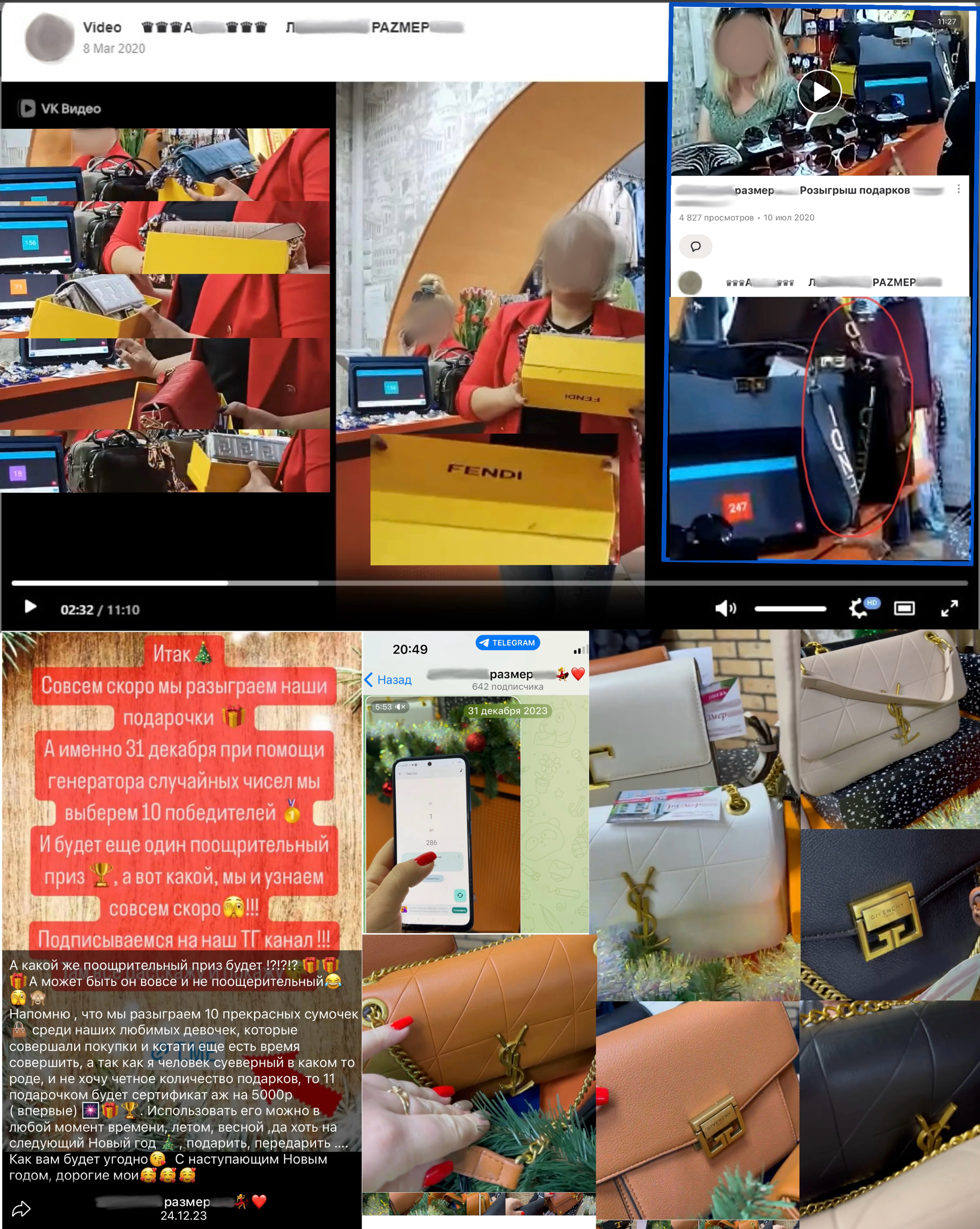 А знаете, что клиенты за это получают «от души»? Конечно же, в основном подделки. Поддельные люксовые сумки, очки. Если не «люкс», то другой дешевый товар или сертификат на их же товары номиналом от 1500 до 5000 рублей. Мало того, что контрафакт здесь продают, его распространяют ещё и «дарением». С учетом того, что я знаю, мне было противно смотреть эти розыгрыши.