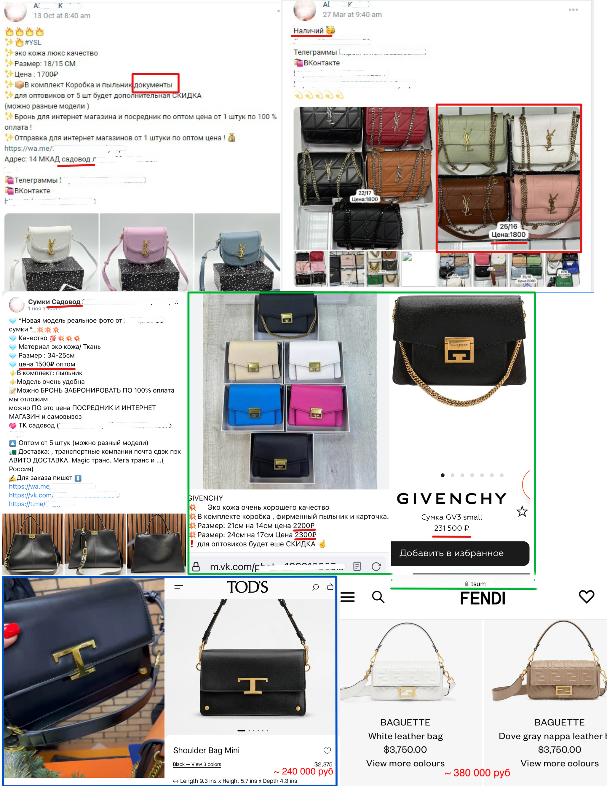 В 2020 году на видео розыгрыша к 8 марта ИП на камеру произнесла фразу: «Не буду говорить под каким брендом, не нужно». Неужели никому из клиентов не стало интересно почему? А потому что в руках у нее была коробка и сумка с логотипом «FENDI». И таких сумок было 5 штук ( остальные не разглядеть). Оригинал стоит ~ 380 000 рублей. Скажите мне, узнав это, много женщин согласились бы ходить с кривой китайской копией этой сумки за 1700 рублей?