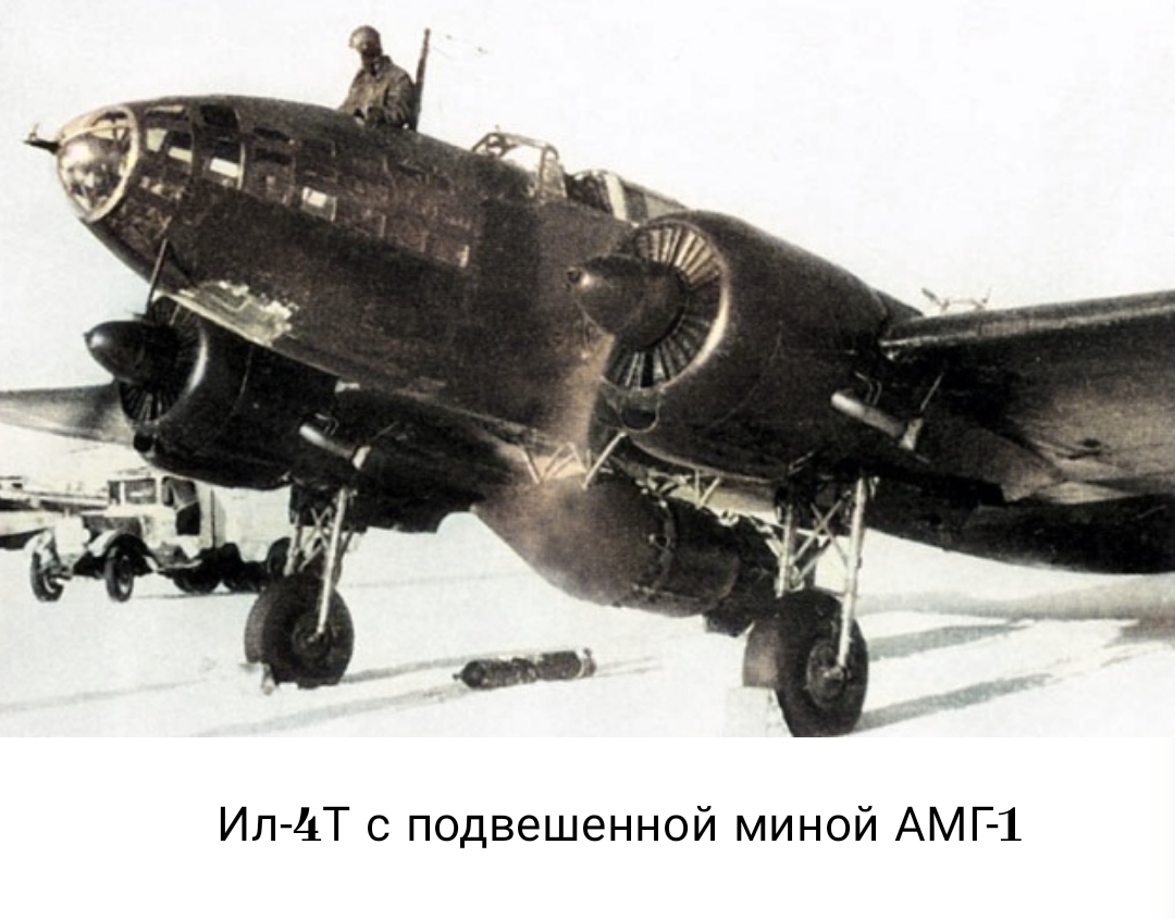 Так что специфика совершенствования морских Ил-4 (иногда их именуют Ил-4Т) заключалась в основном в совершенствовании их вооружения - авиамин и торпед. На торпедах для низкого торпедометания появились стабилизаторы. Они были двух видов: перистые Сагайдука, применявшиеся на Черном море, и цилиндрические АН-42, спроектированные в НИМТИ и использовавшиеся на севере и на Балтике. В декабре 1942 г. приняли на вооружение новые отечественные неконтактные донные мины АМД-500 и АМД-1000 весом соответственно 500 и 1000 кг.