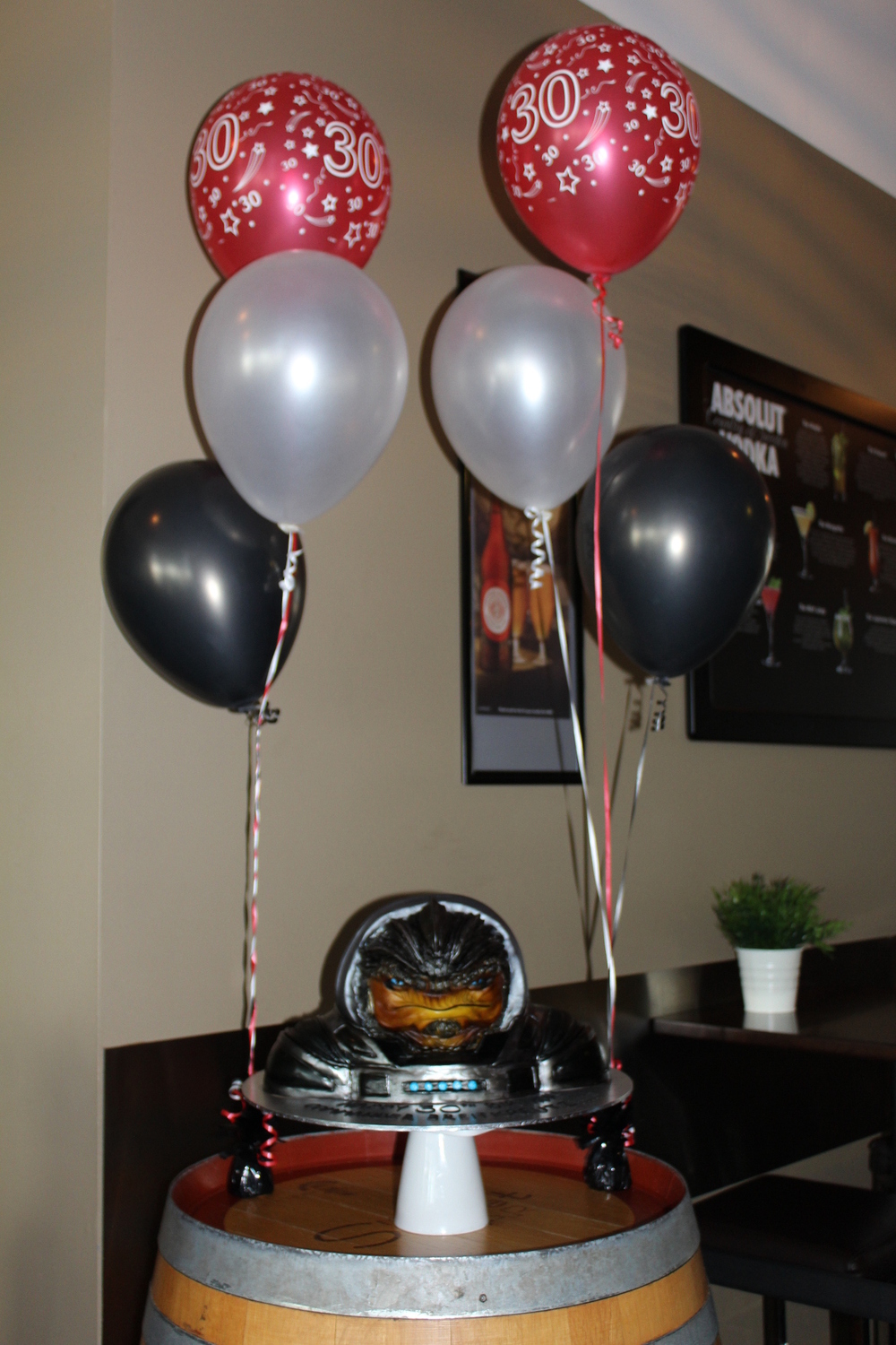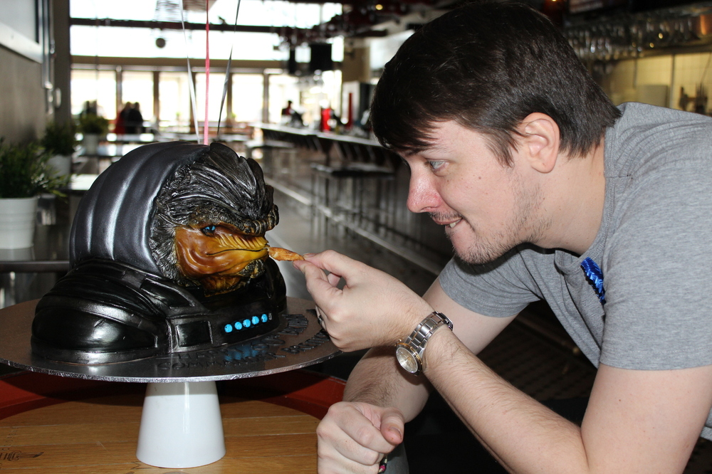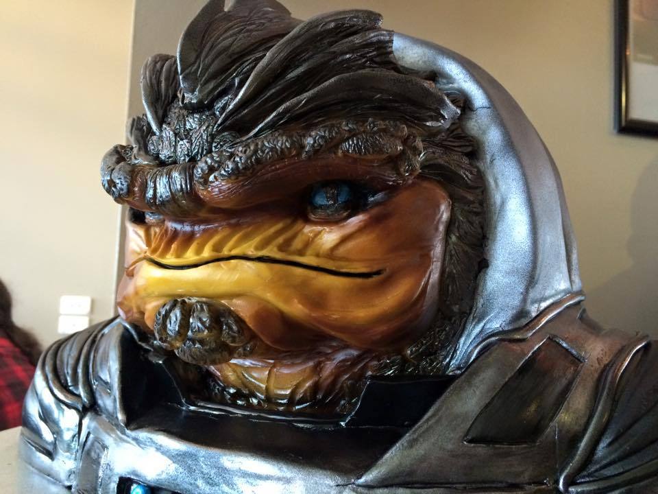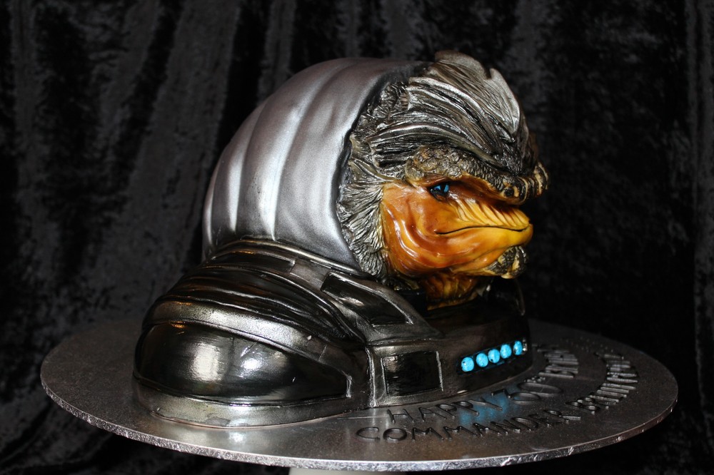 Andrew, who emailed in these fine photos, says underneath this spectacular Krogan specimen is a raspberry and chocolate mud cake. The face is made out of white chocolate and marshmallow fondant or as my colleague described it, a “heart attack cake”.