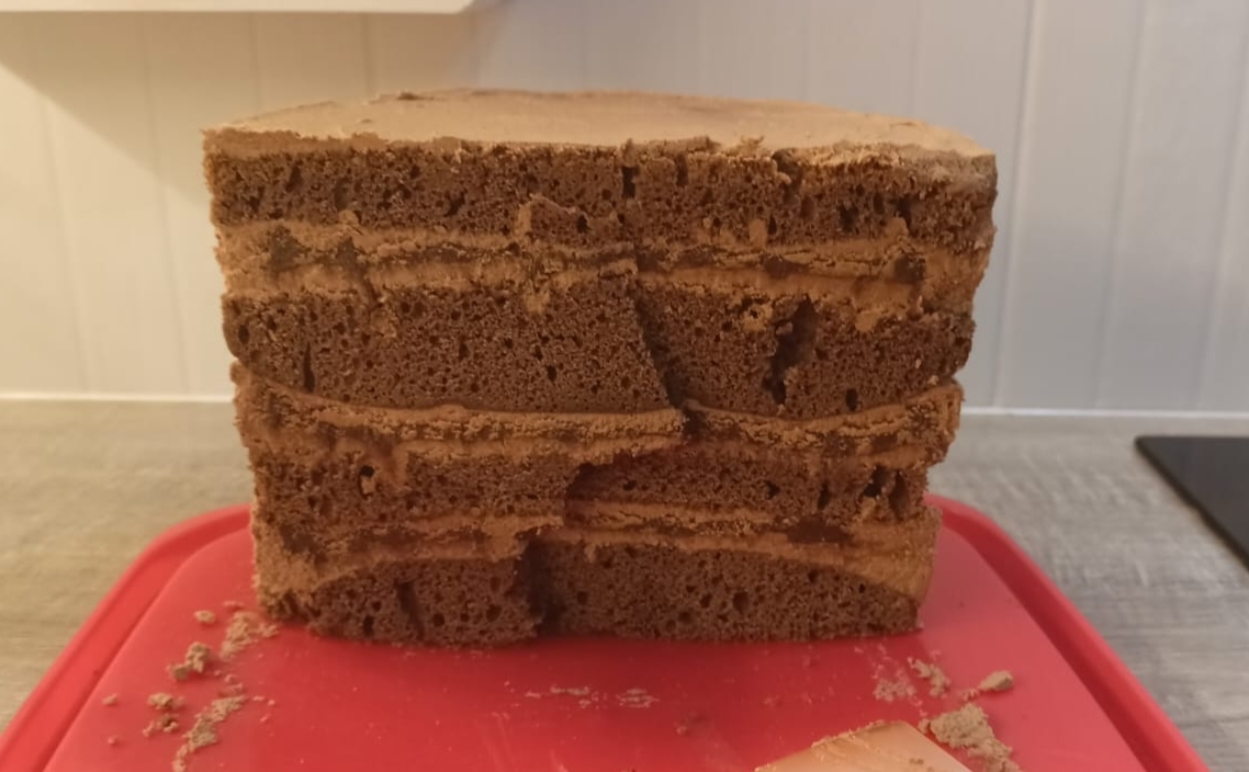 Во все прошлые разы я просто давала коржу остыть при комнатной температуре, потом резала и собирала торт. Но в этот раз во-первых, был уже вечер, и мне не хотелось ждать, во-вторых, это была первая проба духовки и я малость пересушила корж. Так что завернула в пленку и убрала остывать до утра в надежде, что он станет помягче. В принципе так и получилось.