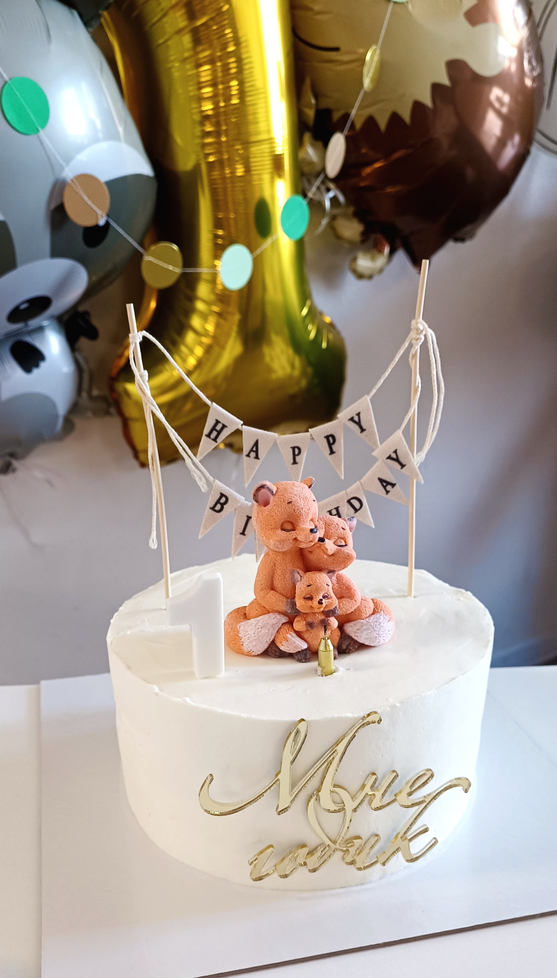 Топпер на торце сделан из пластика ( покупной) шоколадная фигурка из 3 лисенков, олицетворяет семью, папу, маму и малыша 😊