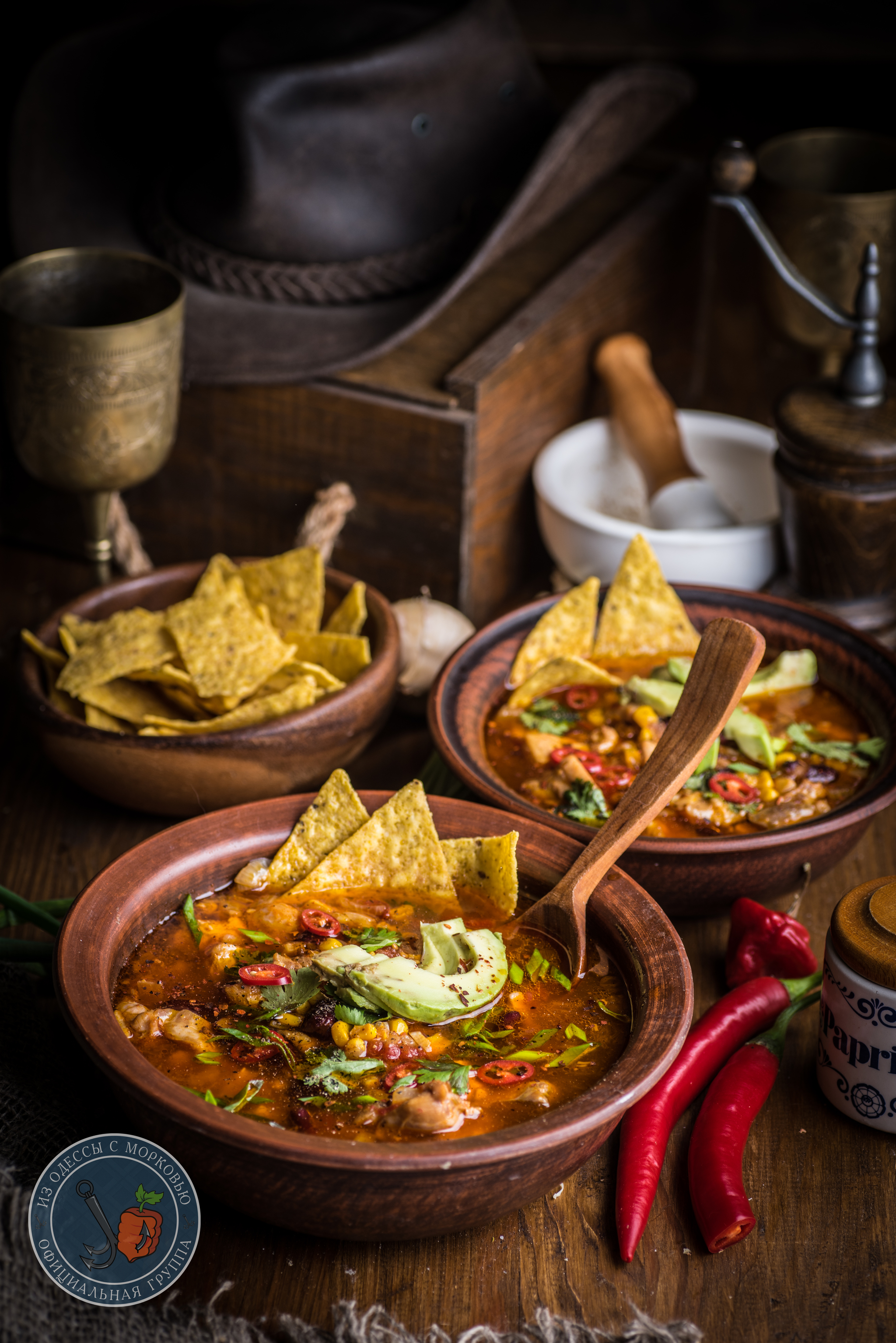 Данный суп представляет из себя мексиканский суп, обычно на курином бульоне, с всевозможными компонентами: фасоль, кукуруза, чили, авокадо и т.д. Отличительной добавкой ко всему этому является халапеньо, чили или что посерьезнее. Второй заметной частью есть тортилья, которую добавляют в виде полосок либо в процессе варки, для загущения, либо в готовое блюдо. Вариаций и модификаций у этого супа предостаточно. Я покажу тот, что зашел лично мне.
