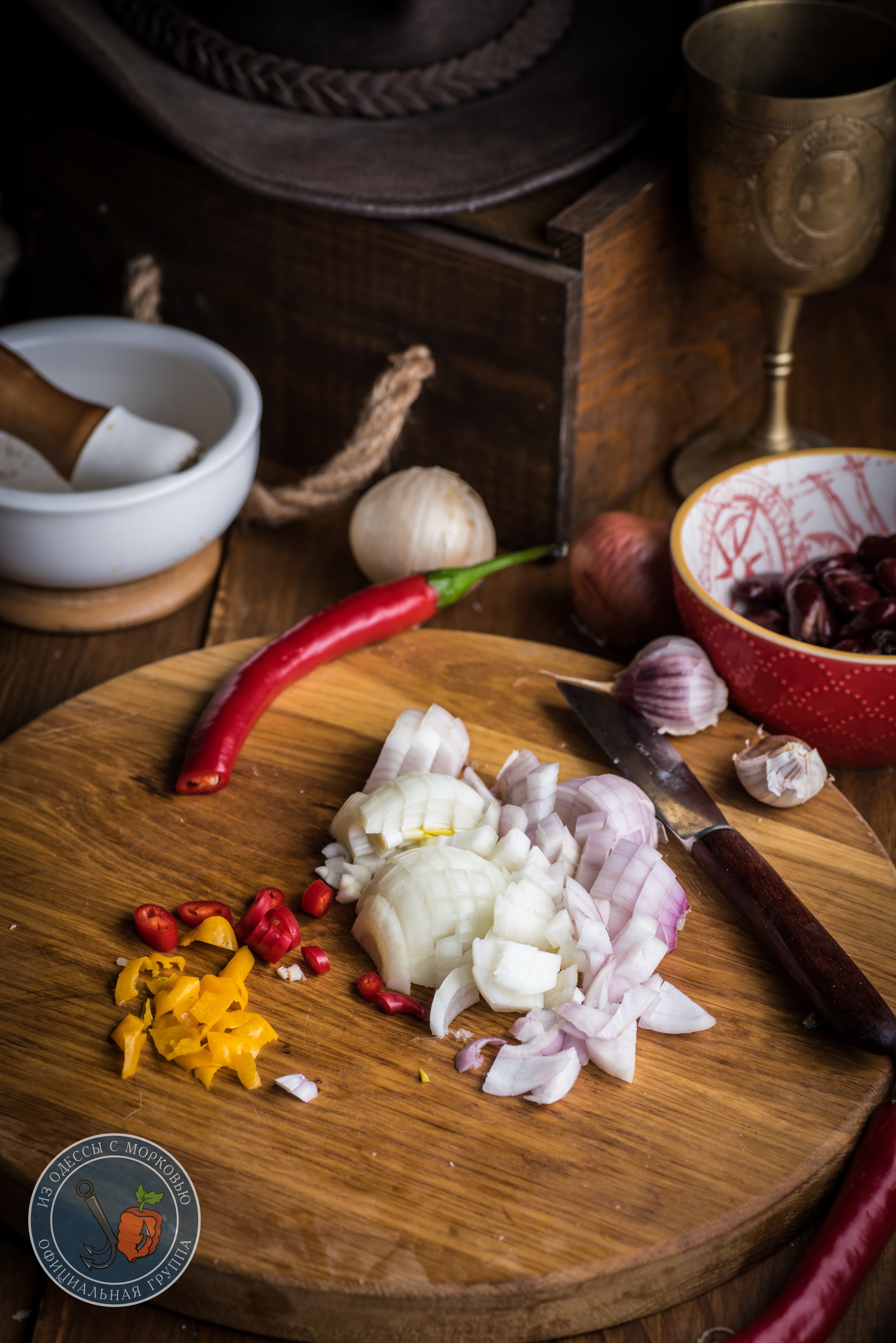 - Лук нарезать кубиком, чеснок раздавить и измельчить, чили попробовать, оценить серьезность ситуации и также нарезать мелко. Помыть нож)