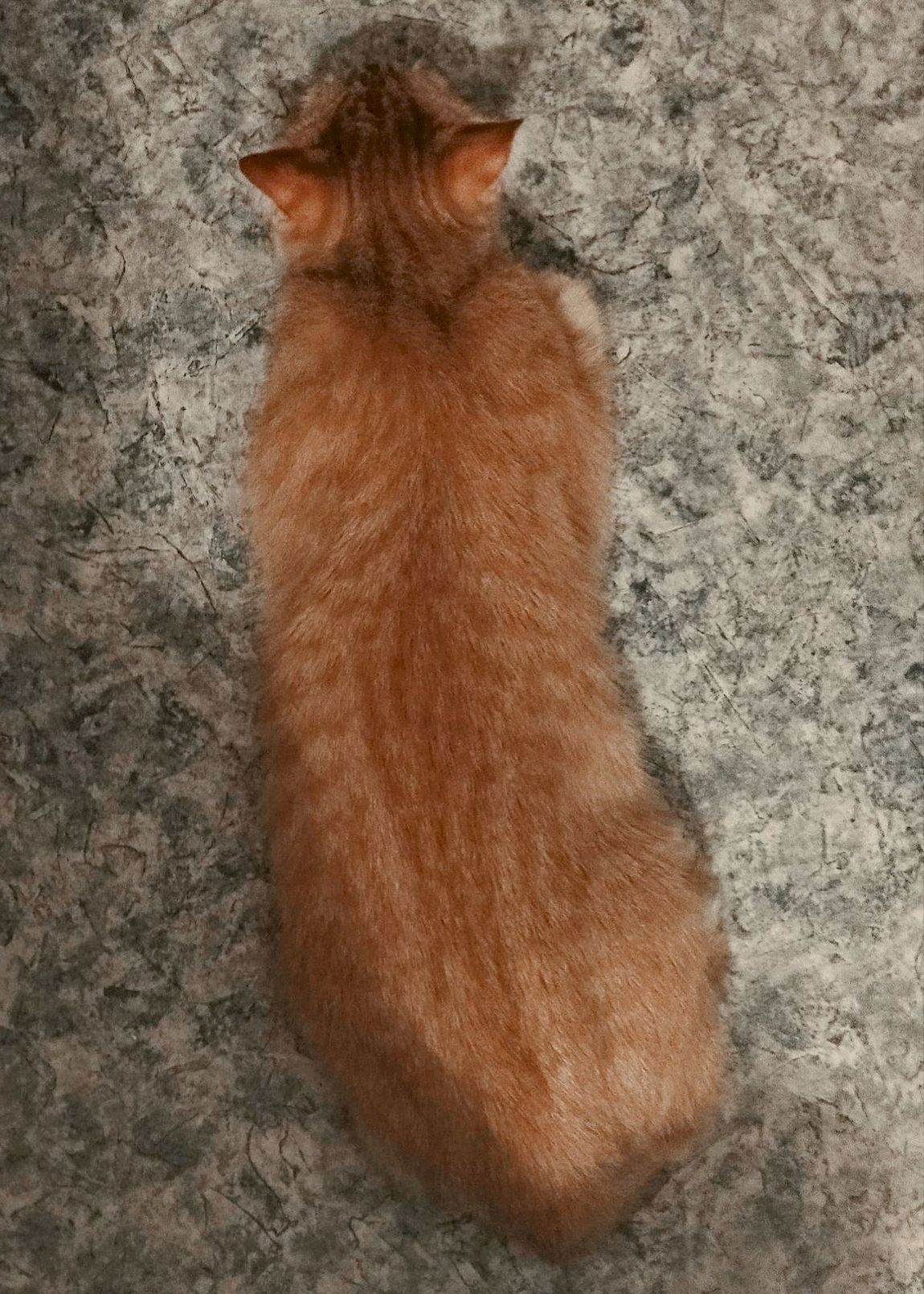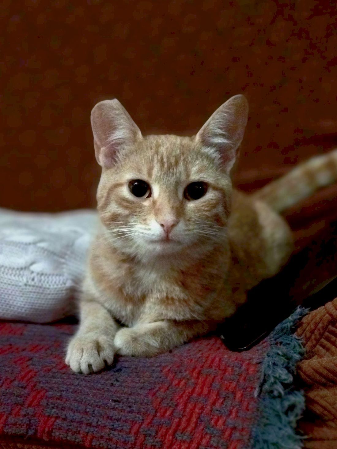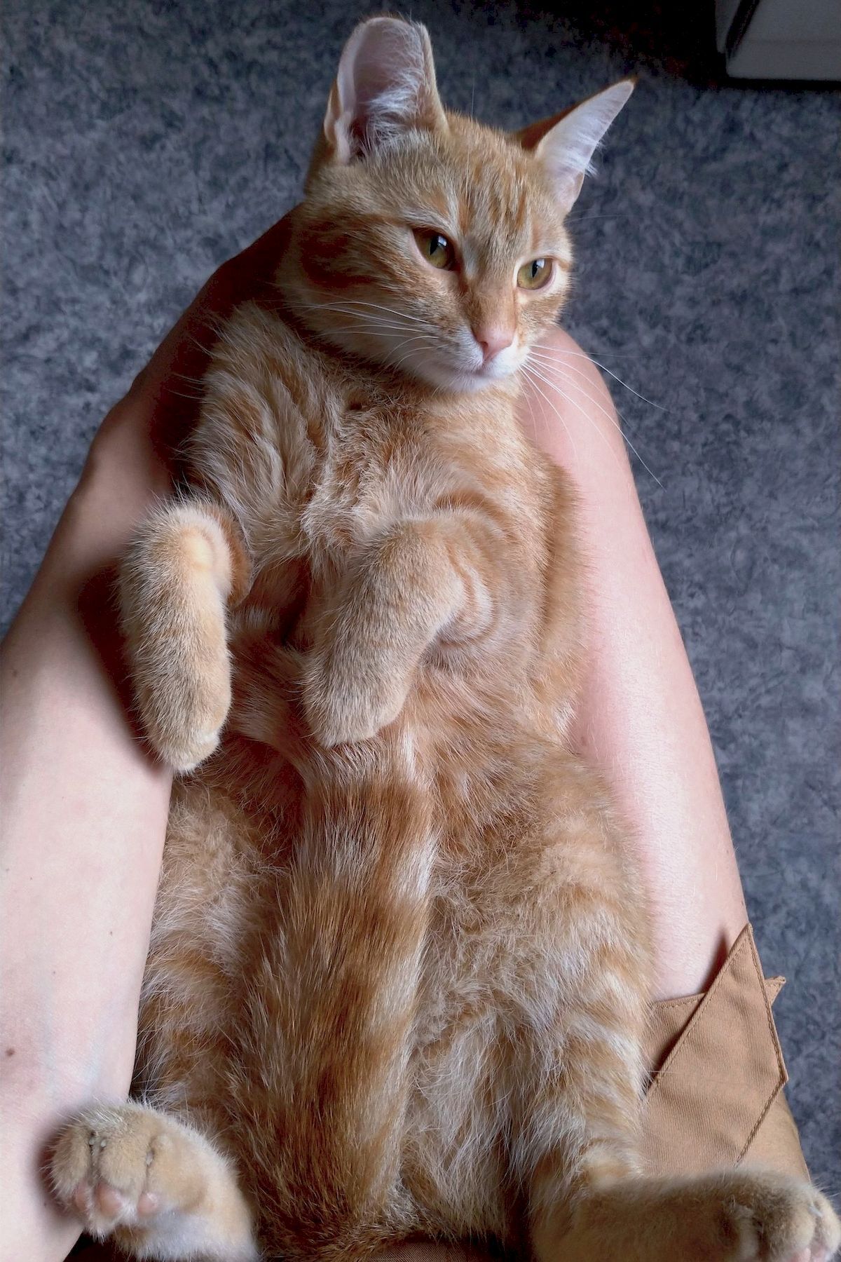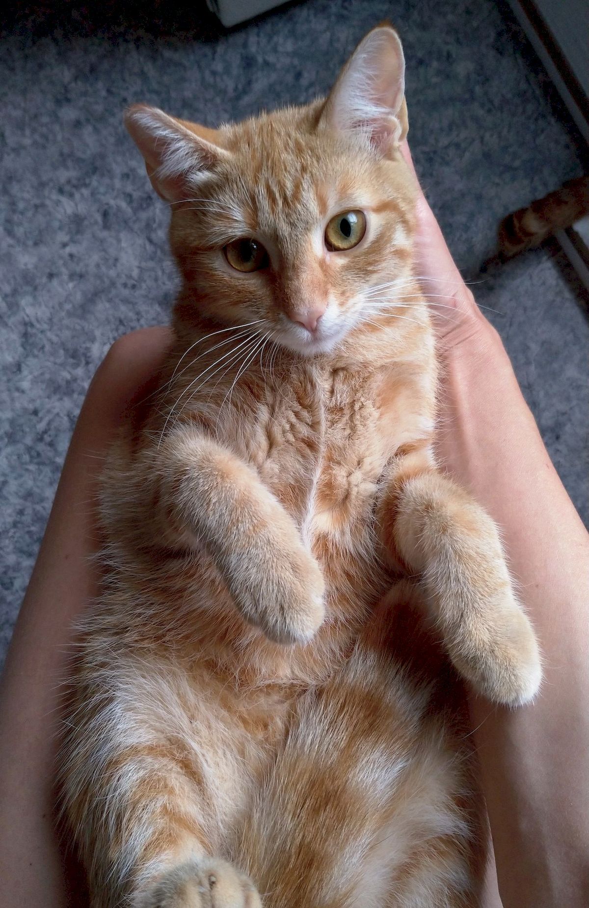Рыжая Тосечка - киса с активной жизненной позицией. Ее с братишкой и сестричками мама-кошка привела в ангар на стоянке для фур и через время пропала. Добрые люди котяток подкармливали, но не так чтобы хорошо и досыта, поэтому с детства Тося живет по принципу "Кто успел - тот и съел" и кидается на еду так, будто приехала с Голодного острова (что почти правда)