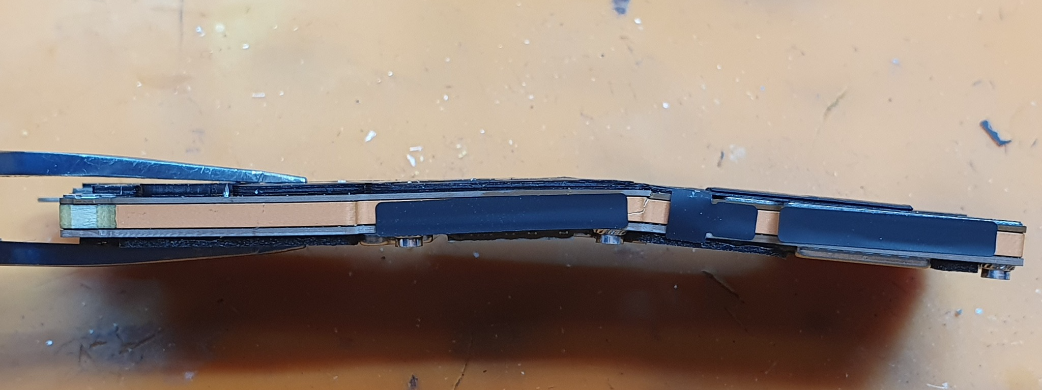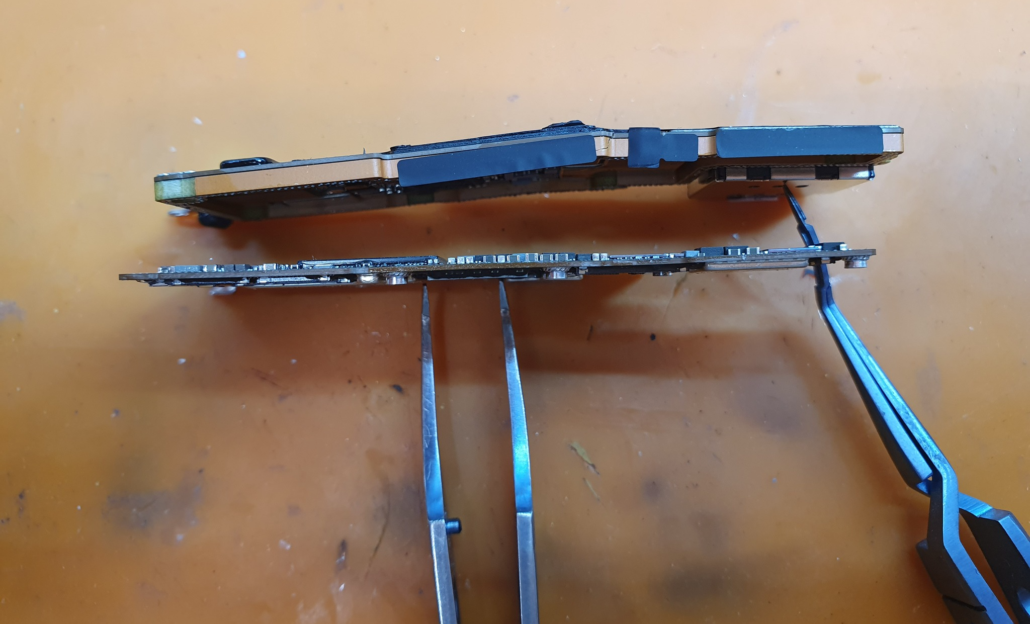 Делается это с помощью незначительного прогрева всей платы. Медные дорожки становятся более эластичные и не порвутся при этом, но при условии, если уже не порвались. Их там много, плата восьмислойная.
