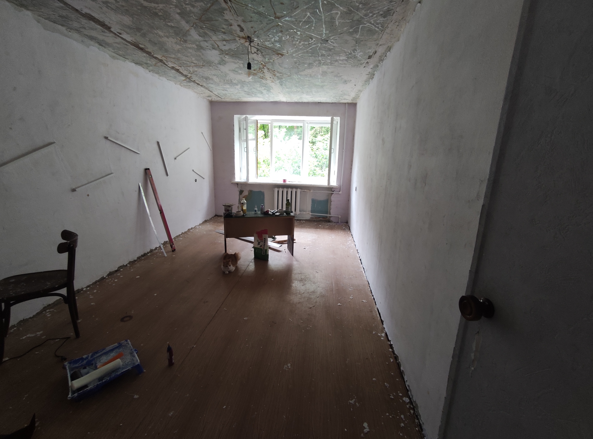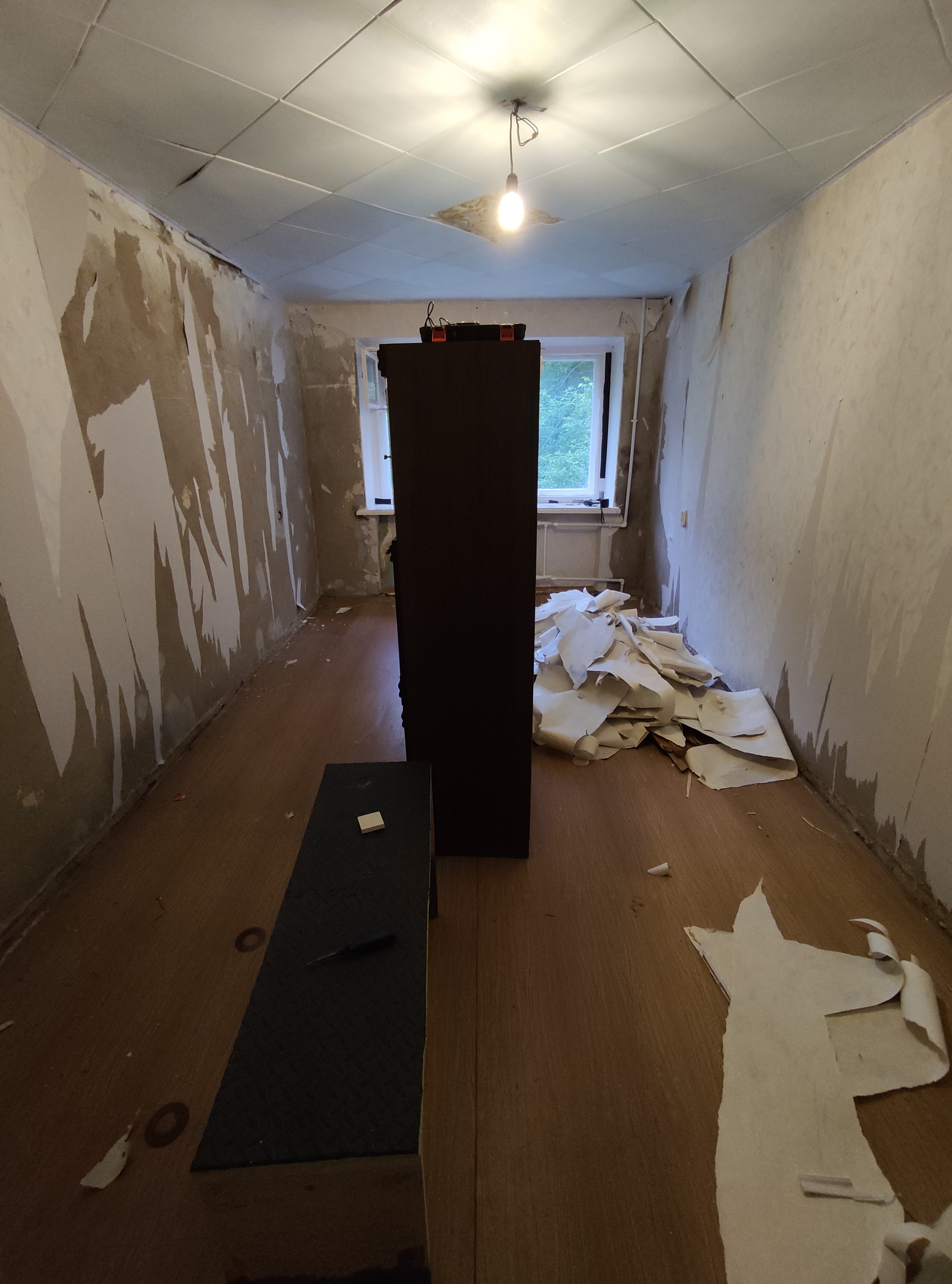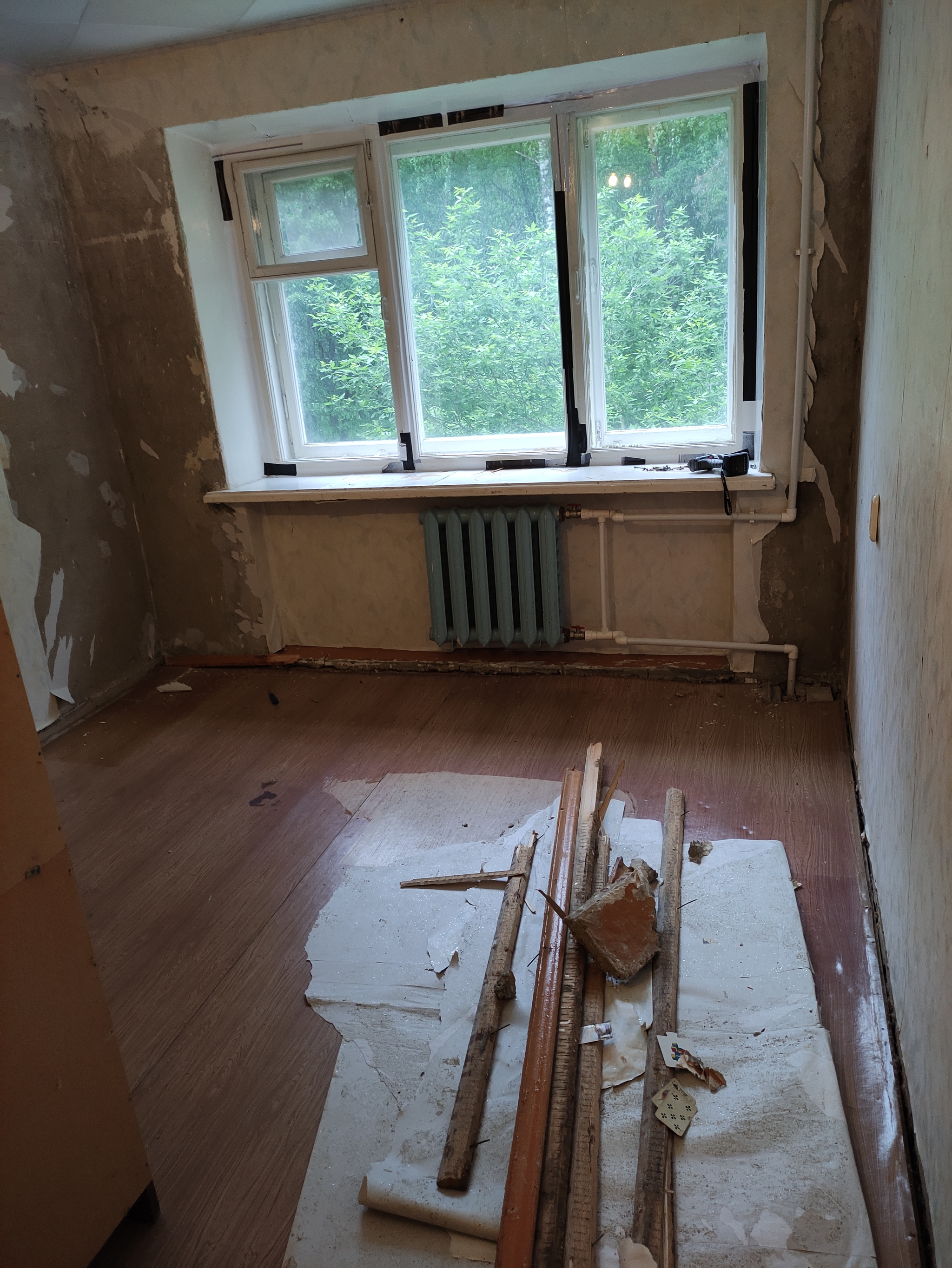 Первым делом демонтаж прелестей в виде деревянных плинтусов, которые старше меня, чудесной потолочной плитки, изящных обоев с блёстками, будь они неладны, снятие уже"самосъемной" на тот момент краски и штукатурки с окна..