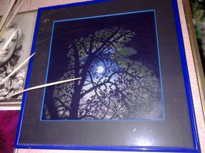 Эту маленькую картинку я называю Лунная ночь. Схема была в каком-то старом рукодельном журнале. Я шила ее трижды, каждый раз на более мелкой канве. Первые две подарены, а эта висит в моем "иконостасе". У меня дома, кстати, совсем немного моих работ - часто дарила.