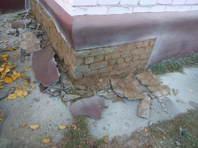 Обращение было по поводу отслоения штукатурки цоколя, приехали, смотрим- сделана из ЦПС, вроде нормально, только звенит и местами отходит- надо вскрывать.