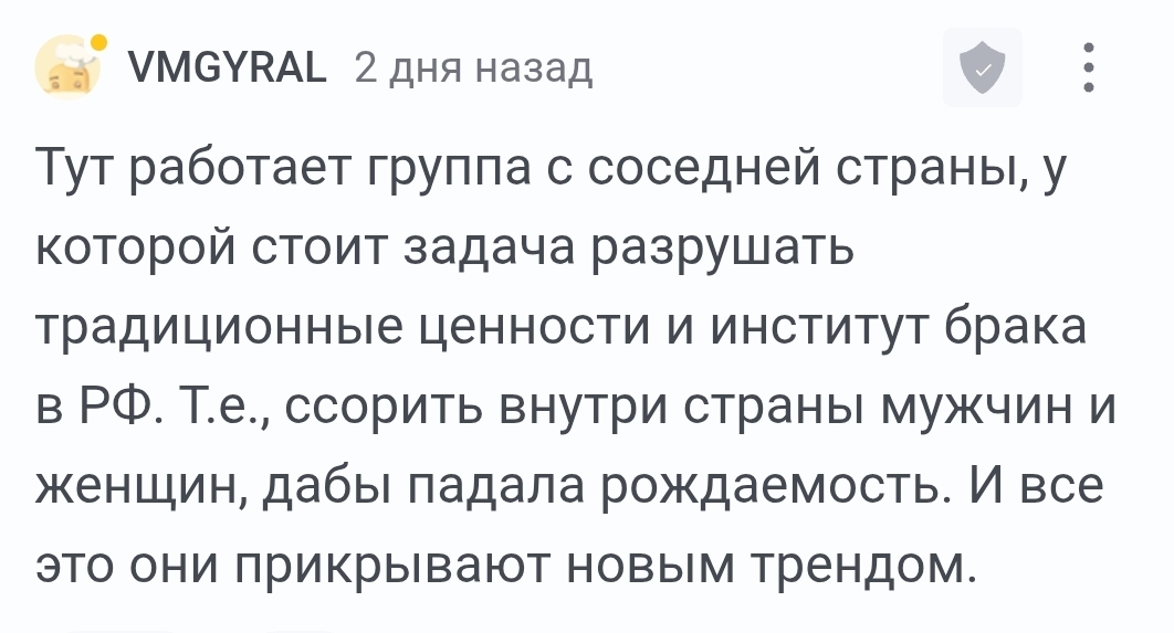 Коллеги, в том числе внутри нашей группы внутри нашей страны, давайте разбираться: в какой момент некоторые граждане соседней с нами страны решили, что традиционные ценности в нашей стране - это меркантильные тарелочницы, разведенки с прицепом и женщины, наполняющие удовольствием воронку женского счастья?