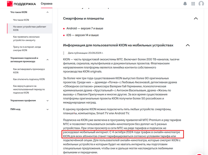 Сегодня вздумалось мне на телефоне, подключенному к мобильному оператору MTS, KION посмотреть. Посмотрел, да вот незадача - МТС взял и весь трафик KIONа c баланса списал. Ну не велика беда - поддержка же поможет и подскажет. Поддержка кстати реально подсказала, что трафик в KION с 4 октября внутри сети МТС тарифицируется и в данном случае рассылка и предупреждение абонентов не осуществляется, а новость была официально опубликована на сайте МТС. Пеняя себе, что я один на всем свете не знаю об этом нововведении от МТС, я сдался на милость google и yandex, но либо руки у меня под поиск новостей от МТС не заточены, либо все еще хуже, но поиск не выдал ничего похожего. Даже на сайт МТС зашел Новости - Саратовская область (mts.ru) - но тоже глухо. Пришлось опять челом бить поддержке и выпрашивать у них ссылку на новость всем давно известную, опубликованную на сайте МТС всем на обозрение, и чудо свершилось, и пришла мне ссылка от самой техподдержки, дословно: Что такое KION. МТС Поддержка (mts.ru)