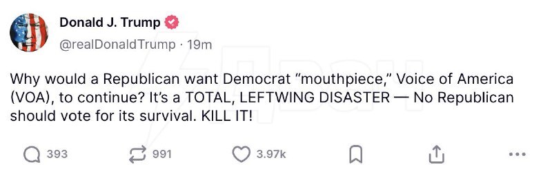 «Зачем республиканцу хотеть, чтобы «рупор» демократов, «Голос Америки», продолжал существовать? Это полная левацкая катастрофа — ни один республиканец не должен голосовать за его выживание. Убейте его!» — написал Трамп в своей соцсети Truth Social.