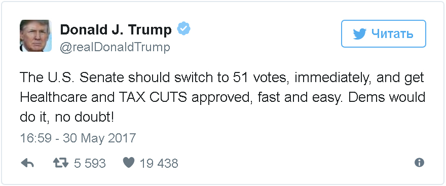 Нынешний глава Белого дома уже не в первый раз критикует регламент Конгресса. В интервью телеканалу CBS в конце апреля Трамп назвал этот порядок работы устаревшим. "Это очень, очень бюрократичная система. Я считаю, регламенты Конгресса, в особенности Сената, невероятно архаичны и неповоротливы", - сказал он, признав, что предложенные им реформы будут продвигаться медленнее, чем планировалось.