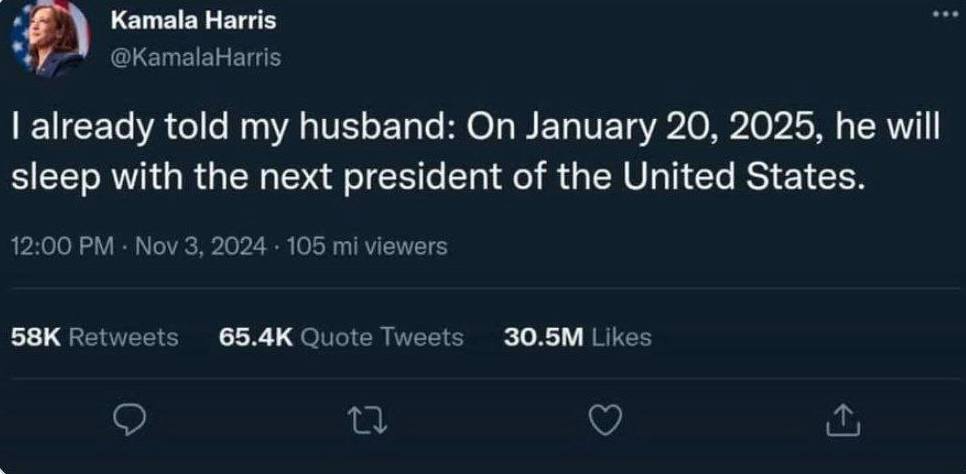 «Я уже сказала моему мужу: 20 января 2025 года (день инаугурации) он будет спать со следующим президентом Соединенных Штатов», — написала Камала.