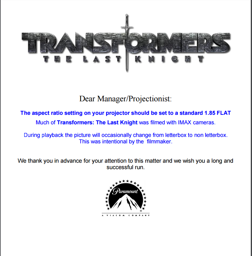 Всем привет. Решил рассказать малость про вышедший вчера фильм Трансформеры: Последний рыцарь. Это не будет обзор фильма, а расскажу вкратце как создатели фильма положили большой болт на зрителя. В общем суть такая, фильм снимался с акцентом на IMAX 3D и для этого в фильм был добавлен эффект, когда обрезается верхняя и нижняя часть экрана, но выстрелы и взрывы выходят за эти рамки. то же самое было и в последних Охотниках за привидениями,но там этот эффект был на протяжение всего фильма и если его смотреть в 2D то это не напрягало. В Трансформеры: Последний рыцарь это сделано на отдельные кадры,т.е. каждые несколько секунд формат картинки меняется и если в 3D это выглядит нормально,то на 2D они забили хер и всё так и оставили и смотреть фильм просто не возможно. И в документах указали,что это задумка создателей (скрин документа приложу.). В общем,если кто соберется на фильм, идите только в IMAX 3D иначе это будут худшие два с половиной часа в кино.