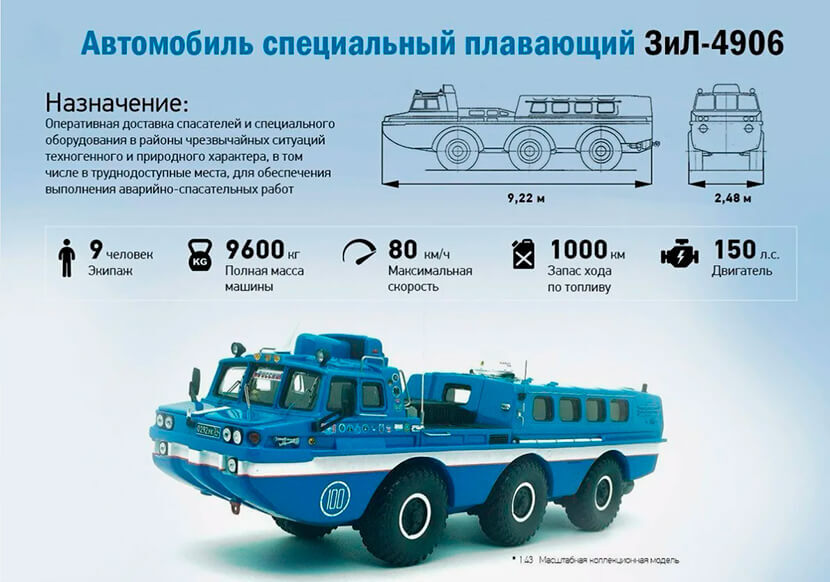 Все три оси в ЗИЛ-4906/49061 имели независимую торсионную подвеску, дисковые тормоза и огромный клиренс 590 мм. При этом и задние, и передние колеса были управляемыми, а давление в шинах могло регулироваться водителем. Причем все три вездехода были амфибиями и при помощи пары гребных винтов с надежным приводом от раздаточной коробки могли плыть со скоростью 8 км/ч. На земле машины разгонялись до 75 км/ч. Максимальный расход бензина у них составлял 75 л на 100 км, благо у них на борту было предусмотрено по паре топливных баков емкостью 260 л каждый.