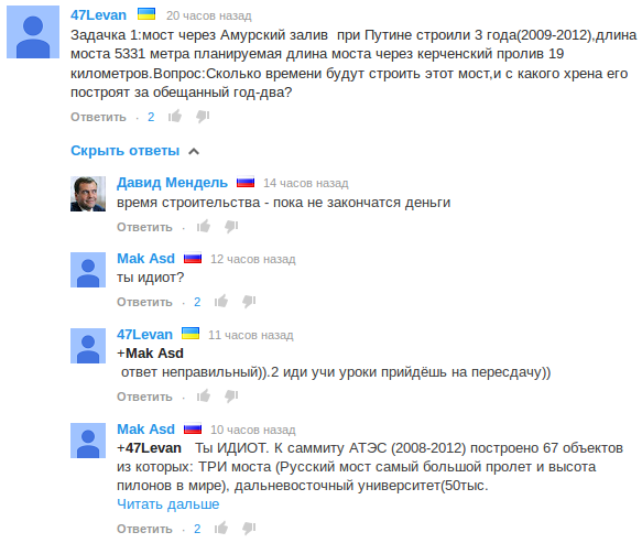 А ну да, ведь ты из этих, которым от строительства моста должно стать лучше. Ты, наверное, дворянских корней и все тебе должны :))