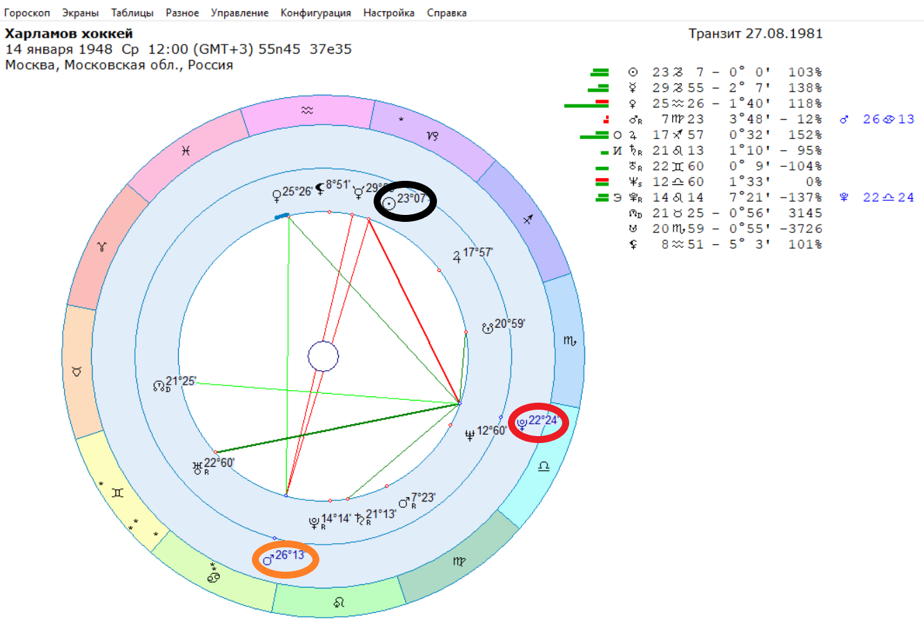 Погиб в аварии В. Харламов. И здесь отработал аспект от Марса (в оранжевом) к Солнцу, как частый признак получения травм. Писала о нем здесь.