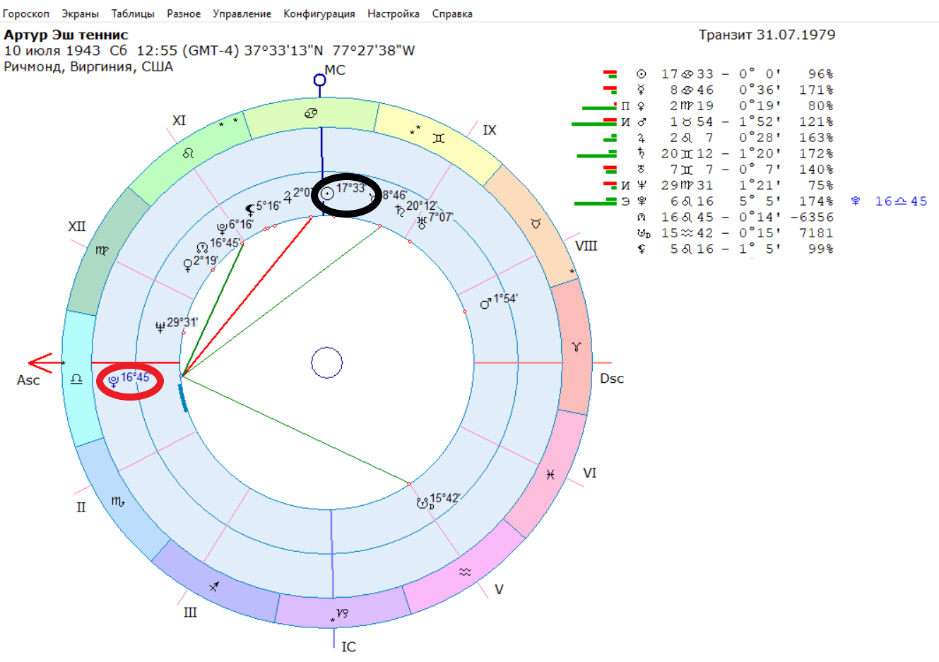 А. Эш пережил сильный сердечный приступ, после которого вынужден был завершить карьеру. В его карте Солнце в 10 доме карьеры, т.е. транзит Плутона, таким образом, завершает его спортивную карьеру, он "умирает" как спортсмен.