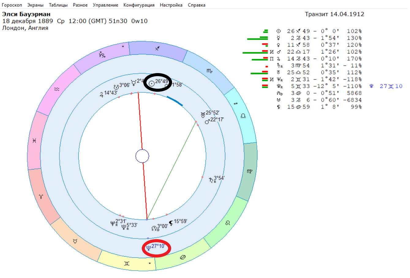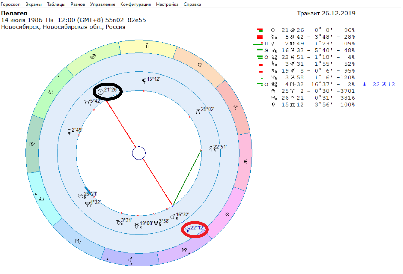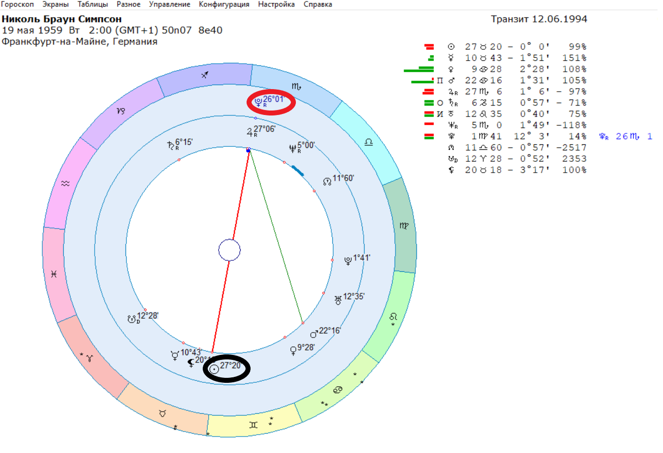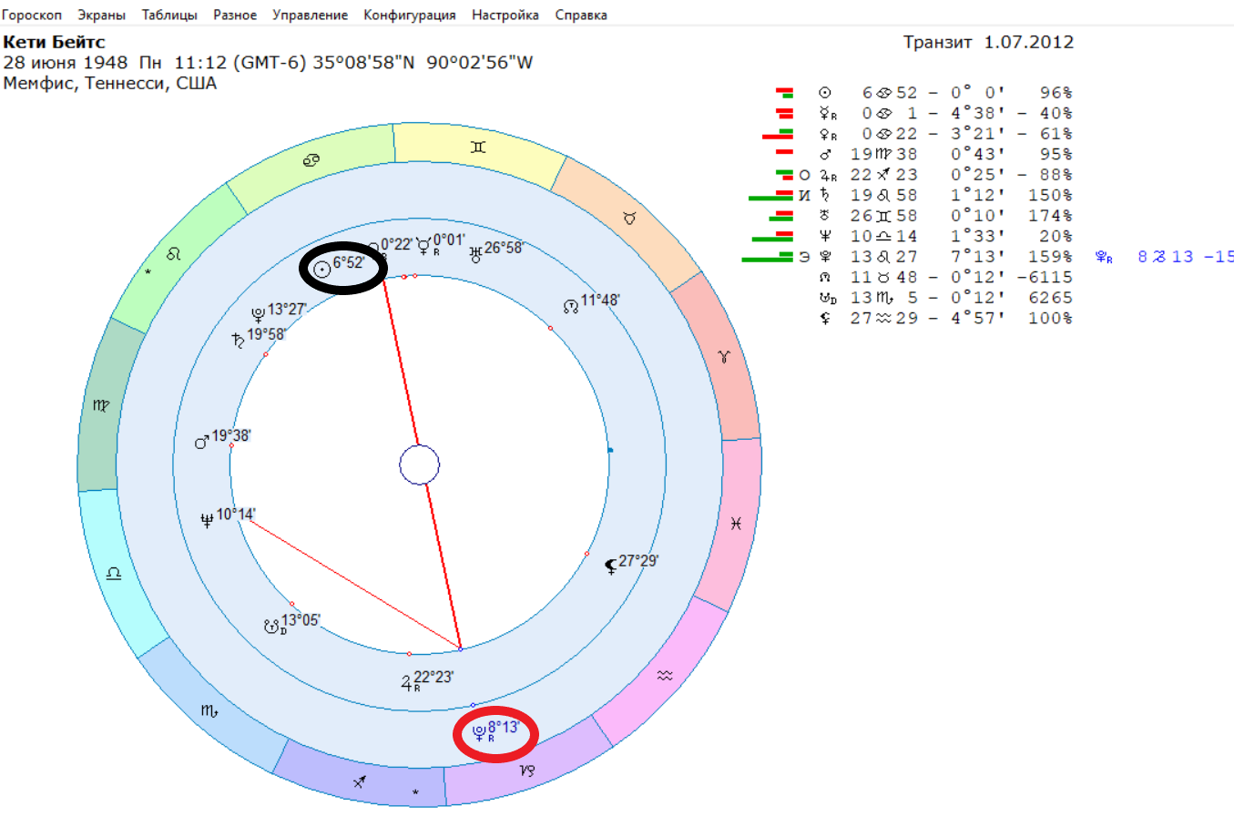 Теперь переходим к картинкам. Натальное Солнце (Солнце в момент рождения человека) будет обведено в черный кружок, транзитный Плутон (положение планеты в день события) будет обведен в красный.