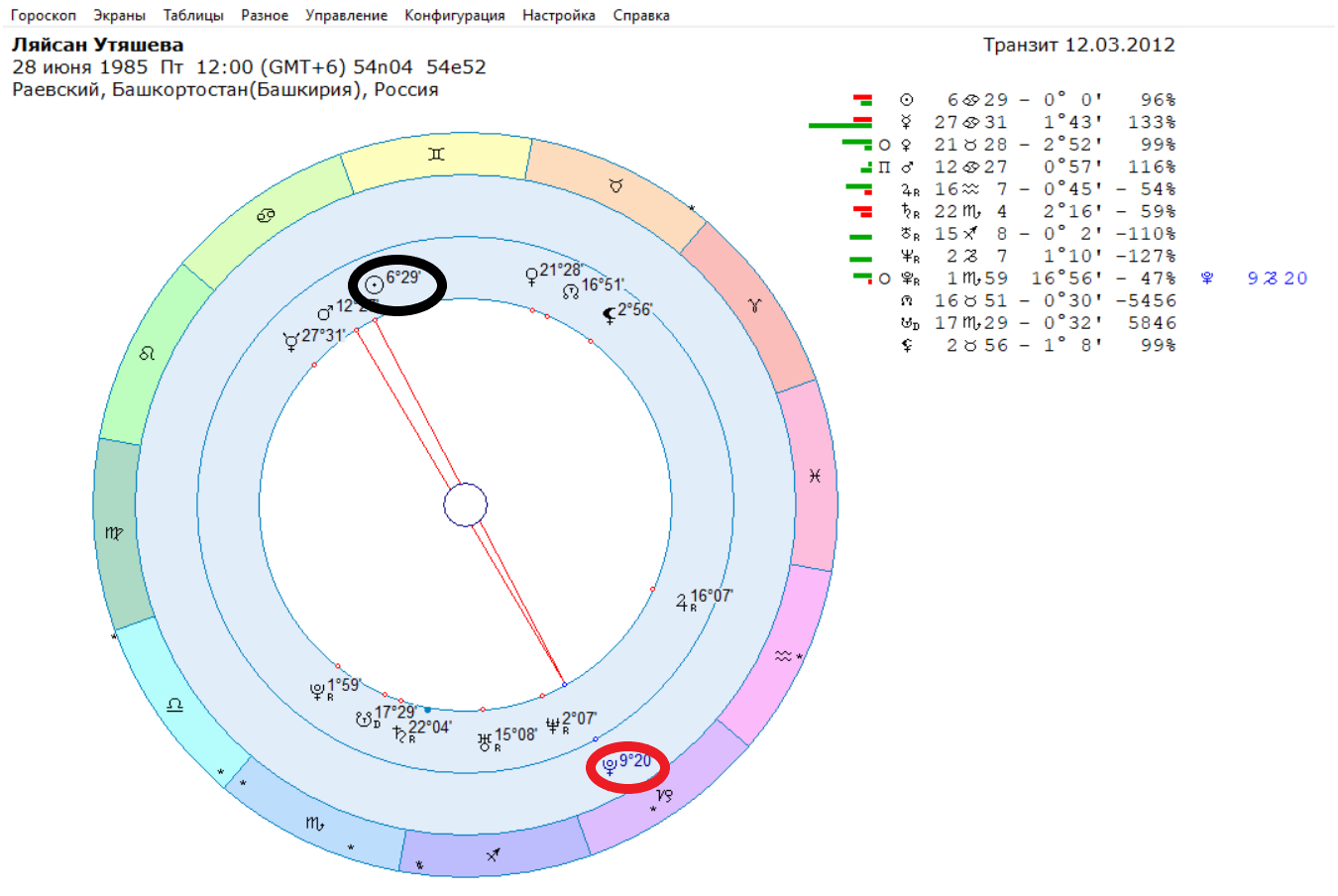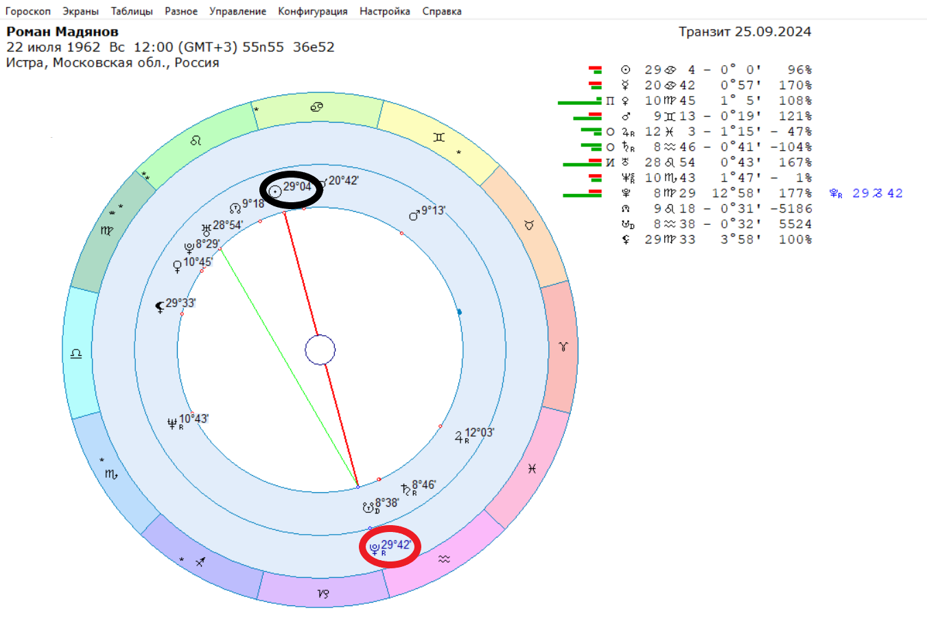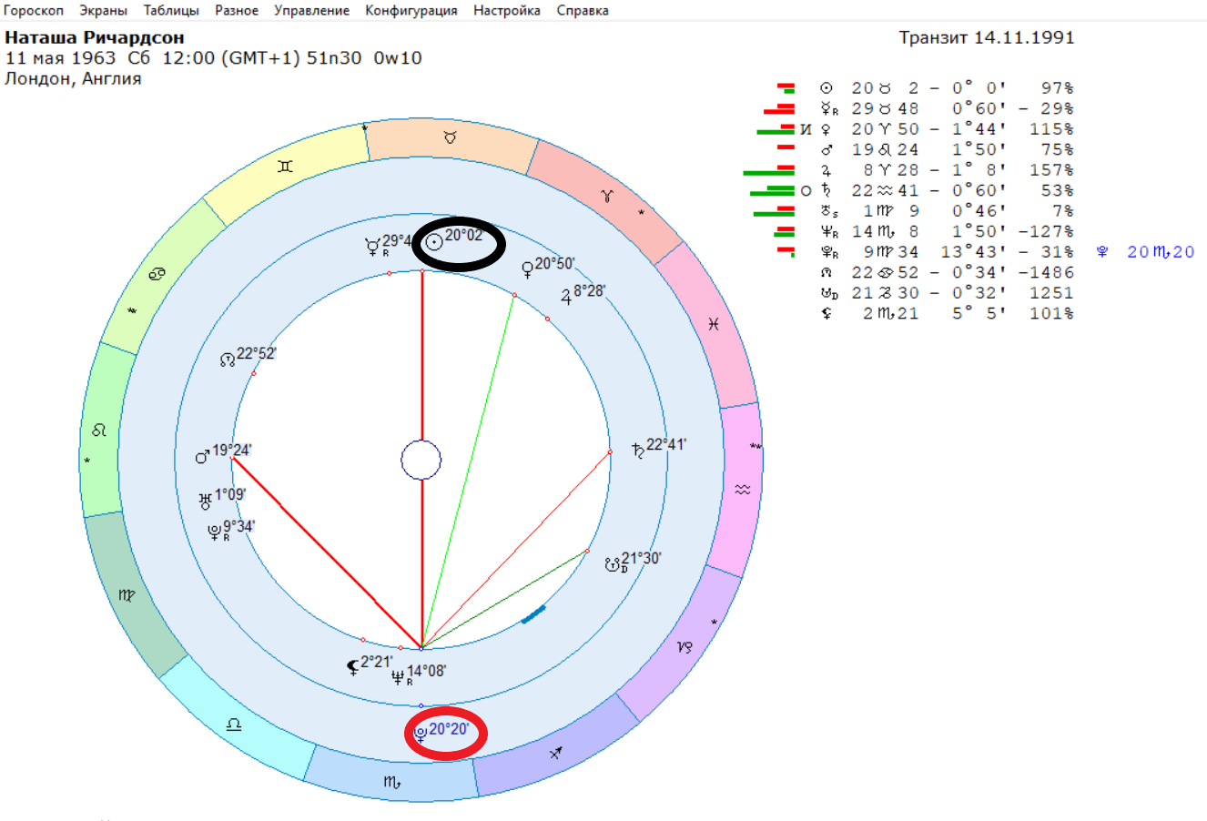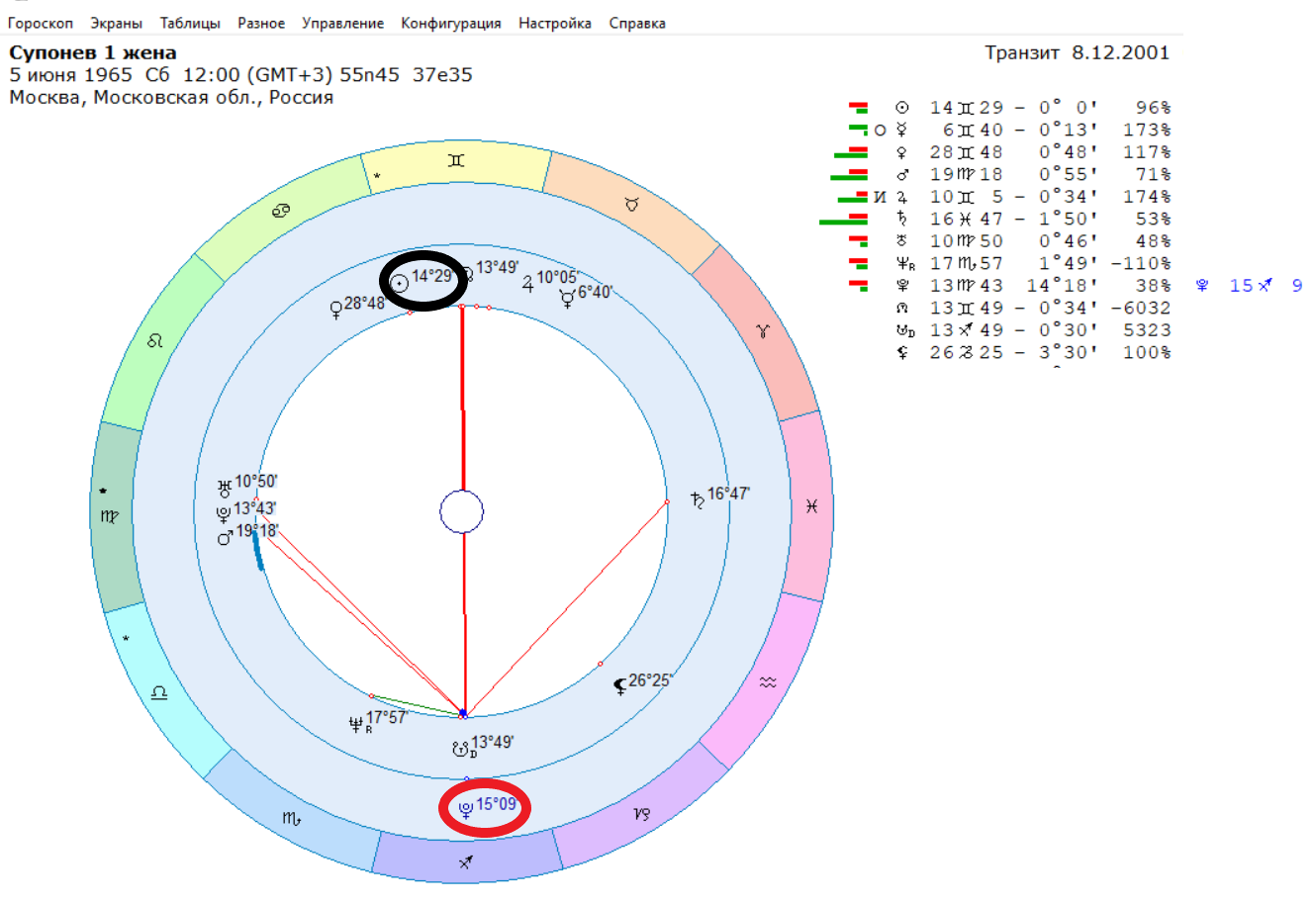 Теперь переходим к картинкам. Натальное Солнце (Солнце в момент рождения человека) будет обведено в черный кружок, транзитный Плутон (положение планеты в день события) будет обведен в красный.