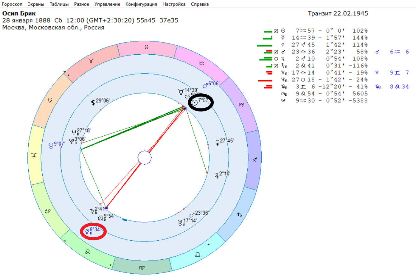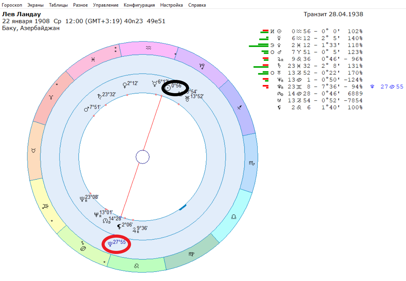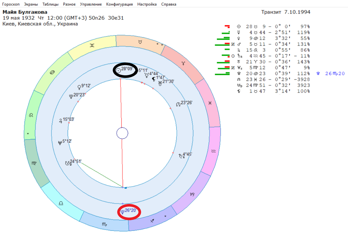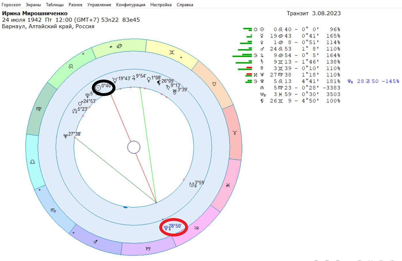 Теперь переходим к картинкам. Натальное Солнце (Солнце в момент рождения человека) будет обведено в черный кружок, транзитный Плутон (положение планеты в день события) будет обведен в красный.