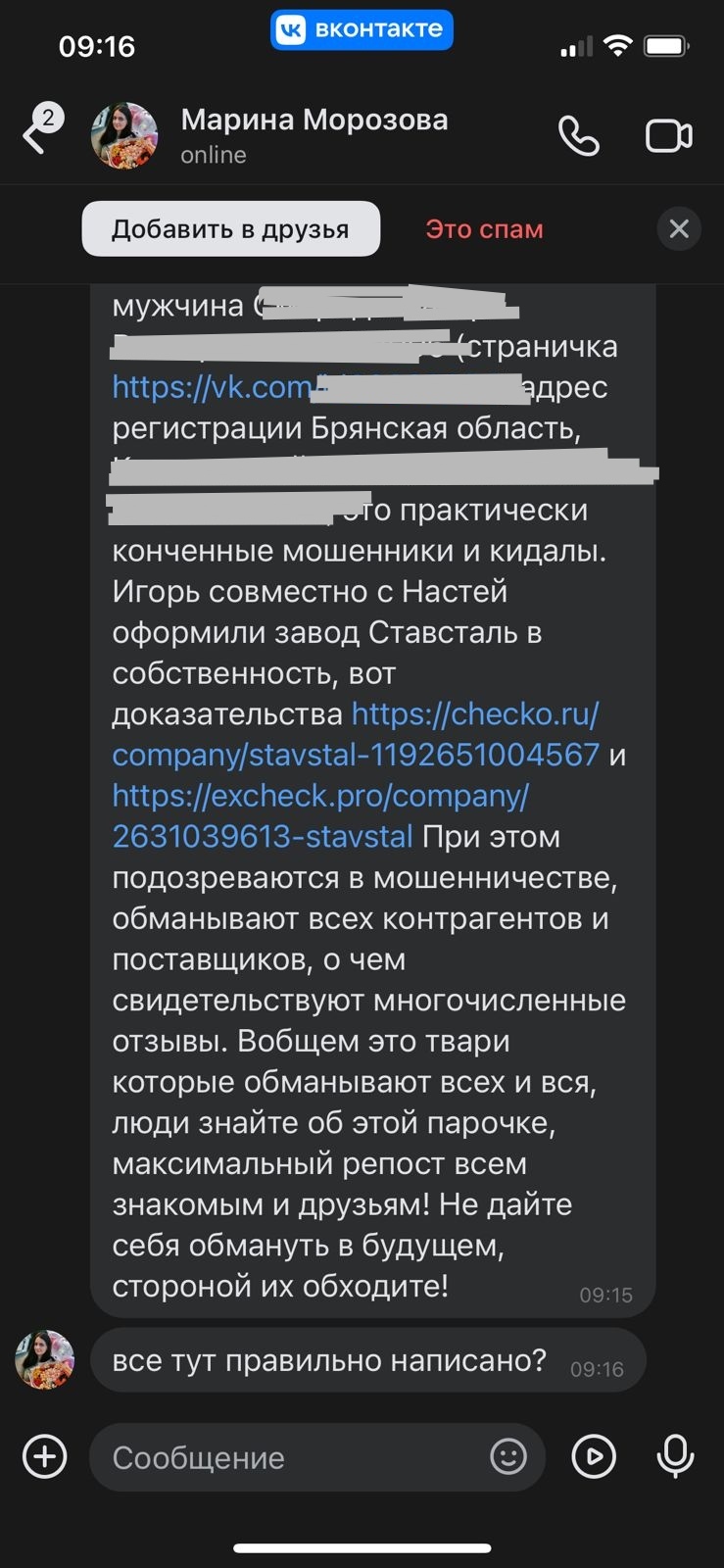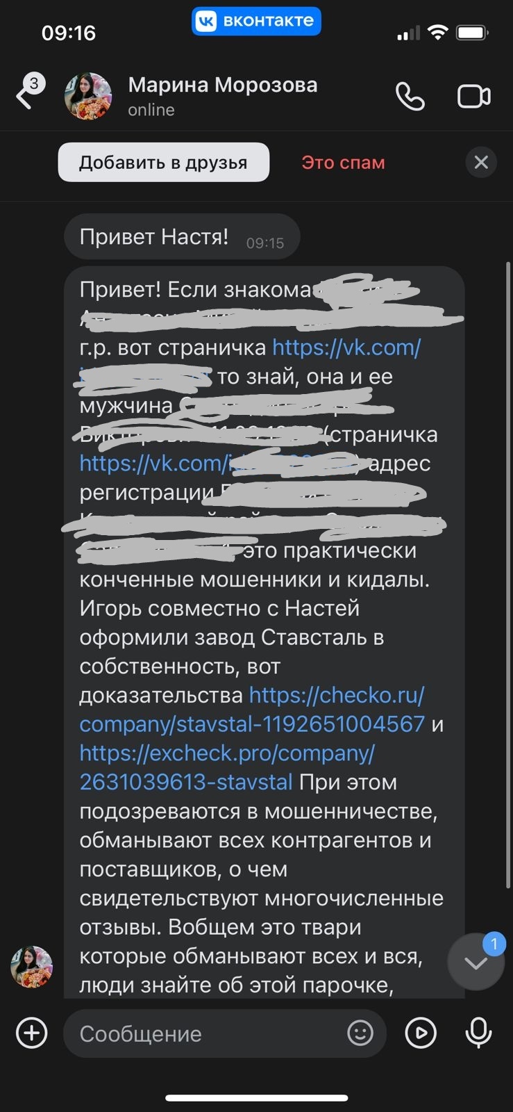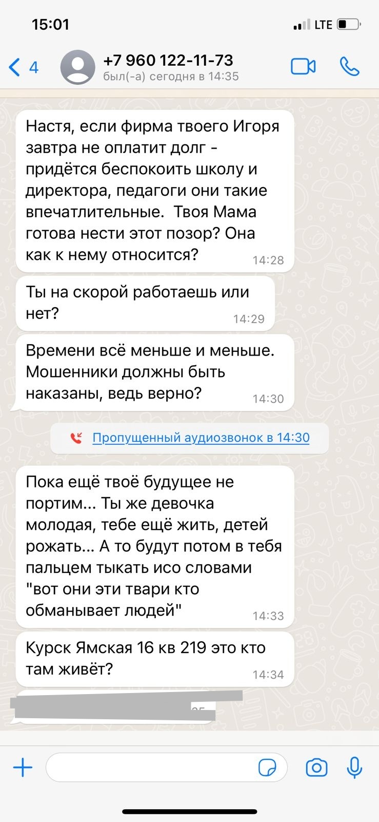 Попали с женой в неприятную ситуацию. Позвонил жене неизвестный номер, спросили знаем ли мы какого-то человека, она ответила, что знает (это какой-то знакомый, связь с которым уже давно не поддерживается) . Люди на том конце телефонной трубки решили, что мужской голос на заднем фоне это необходимый им человек, после этого началось самое интересное, начались настойчивые звонки, сообщения с угрозами. Объяснения, что это не необходимые им люди ни к чему не приводили, поэтому номера были занесены в чёрный список, после этого начали названивать со скрытых номеров, поставили на сброс с неизвестных номеров(айфону отдельное "спасибо" , за то, что о каждом сброшенном звонке он уведомляет). На следующее утро списку друзей разослали неприятное сообщение, с фотографией моей жены, о том что она совместно с розыскиваемым человеком(должником) обманывает людей и, к нашему удивлению, владеет заводом. Связались с родственниками жены, оказалось что у них такая же ситуация, её мама учитель и решили давить и на неё(если смогу, приложу скриншоты сообщений из ватсапа) , на учителей школы, в которой работает её мама.