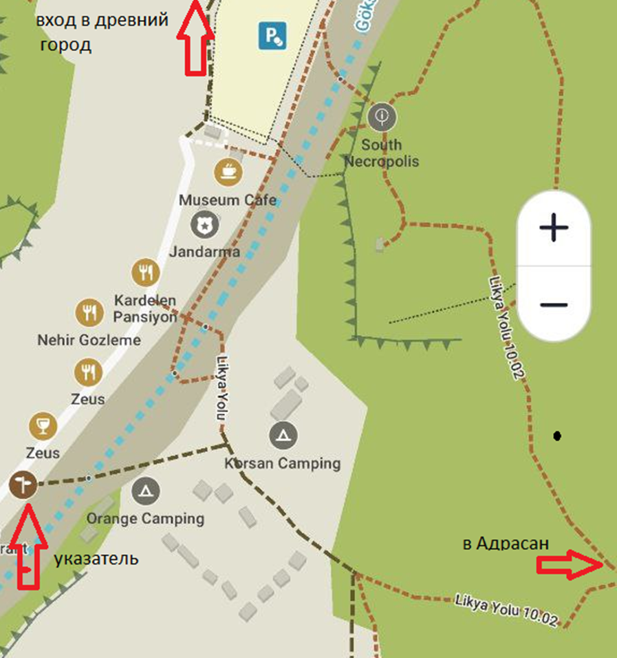 Можно посетить древний город, но следует иметь в виду, что маршрут через гору в Адрасан и знакомство с этим чудесным местом и так может занять весь день. Кроме того, могут быть задержки с выездом из Адрасана, долмуши до трассы там ходят только в пляжный сезон.