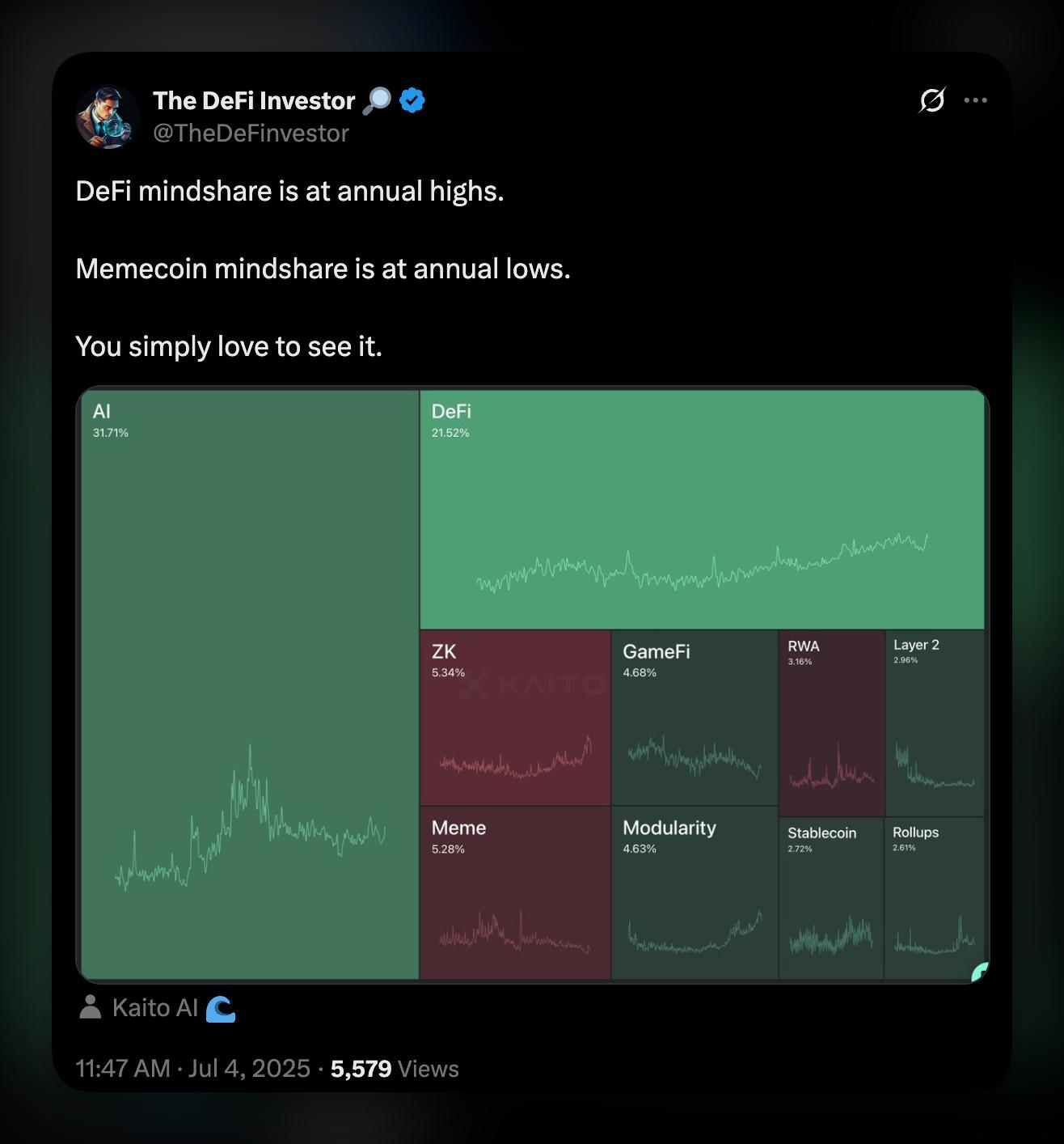 - AI-сектор занял 31,7% внимания рынка, а DeFi — 21,5%. Для сравнения, мемы резко просели до 5,3%, уступив место ZK-технологиям и GameFi.
