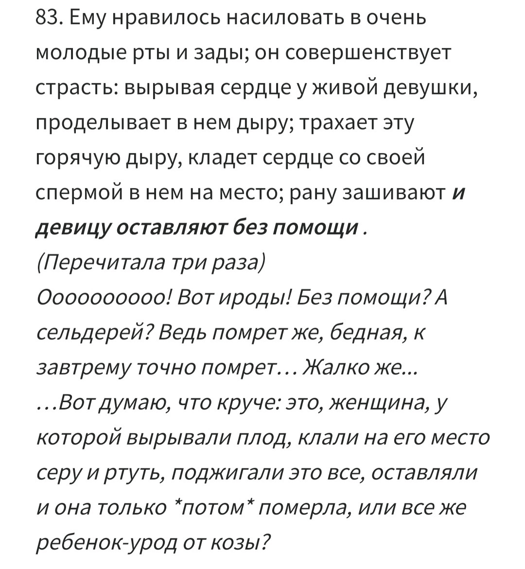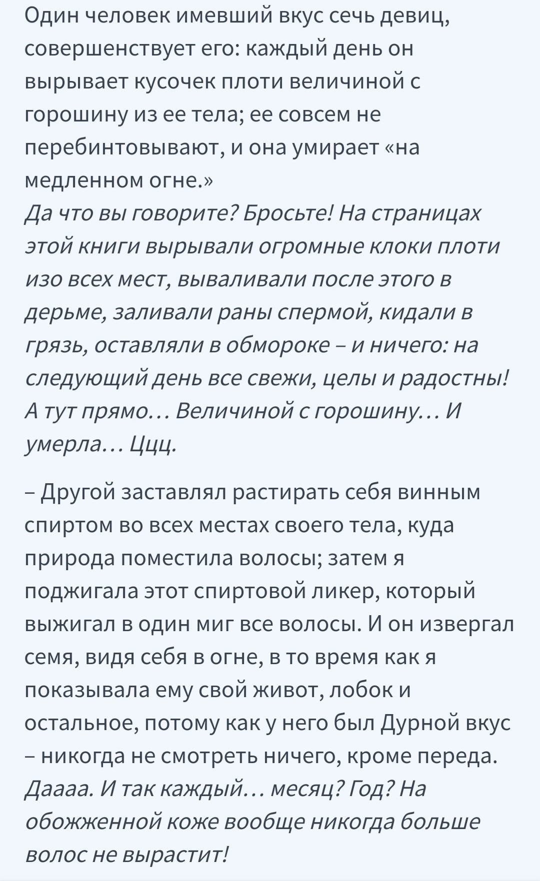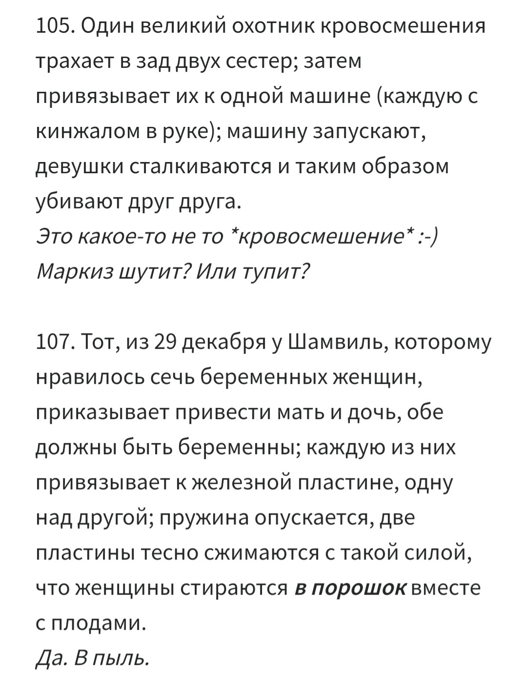 Человек читал "Сто двадцать дней Содома" и стебался. Пожалуй, только с таким подходом эту книгу и можно дочитать.
