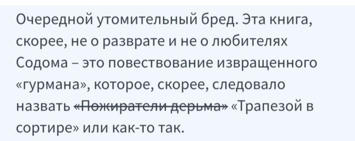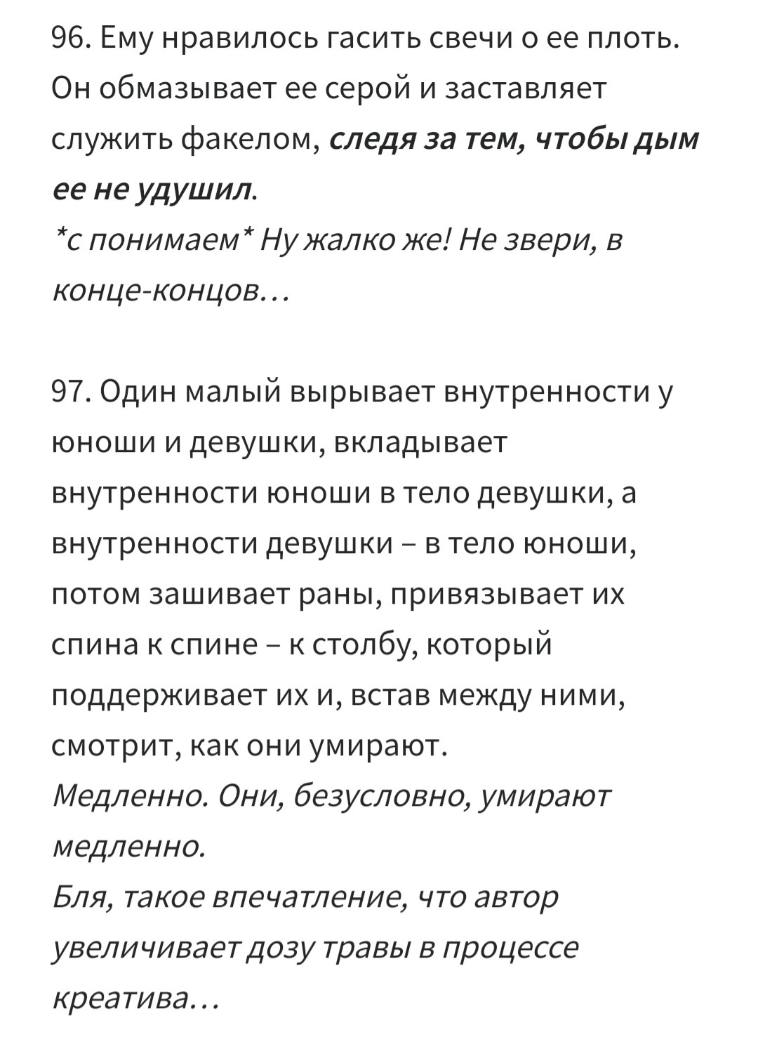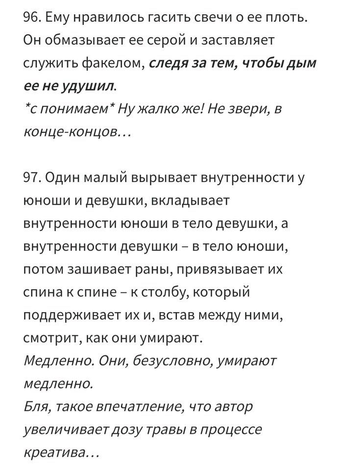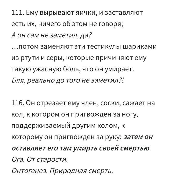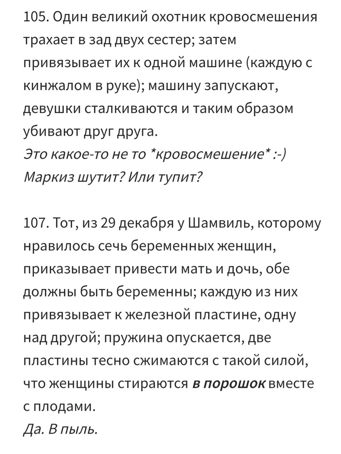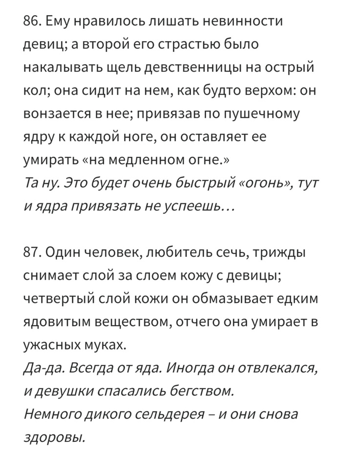 Человек читал "Сто двадцать дней Содома" и стебался. Пожалуй, только с таким подходом эту книгу и можно дочитать.