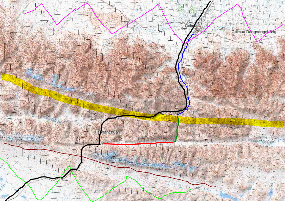 растительность только по понижениям сухих русел, которые наполняются только при сильных дождях и, в основном, по большей части при таянии снега весной в горах. Так тут весьма сухо, несмотря на иногда перманентно-часто заряжающий именно моросящий дождь то тут, то там.. но не сплошным потоком везде. Это "капля в море", как говорится. Хотя здесь он вдвойне (как минимум) неприятен, т.к несёт тут знатно - и микро-капли (морось, по большей части) врезаются в тебя со всей силой. Особенно в продольной каньоно-образной такой долине в 40 км, где ветер разгоняется. И просто всё несёт с вершин гор в сторону более низкой высоты к основной долине-каньону, которая прорезает весь здесь Куньлунь - от Тибетского нагорья до Цайдамской впадины (бассейна) - чёрная линия на карте-схеме, где к.р и проходит авто и ж/д дороги, река Найчин Гол и её притоки.