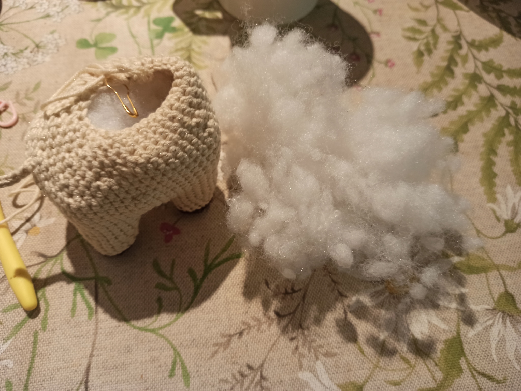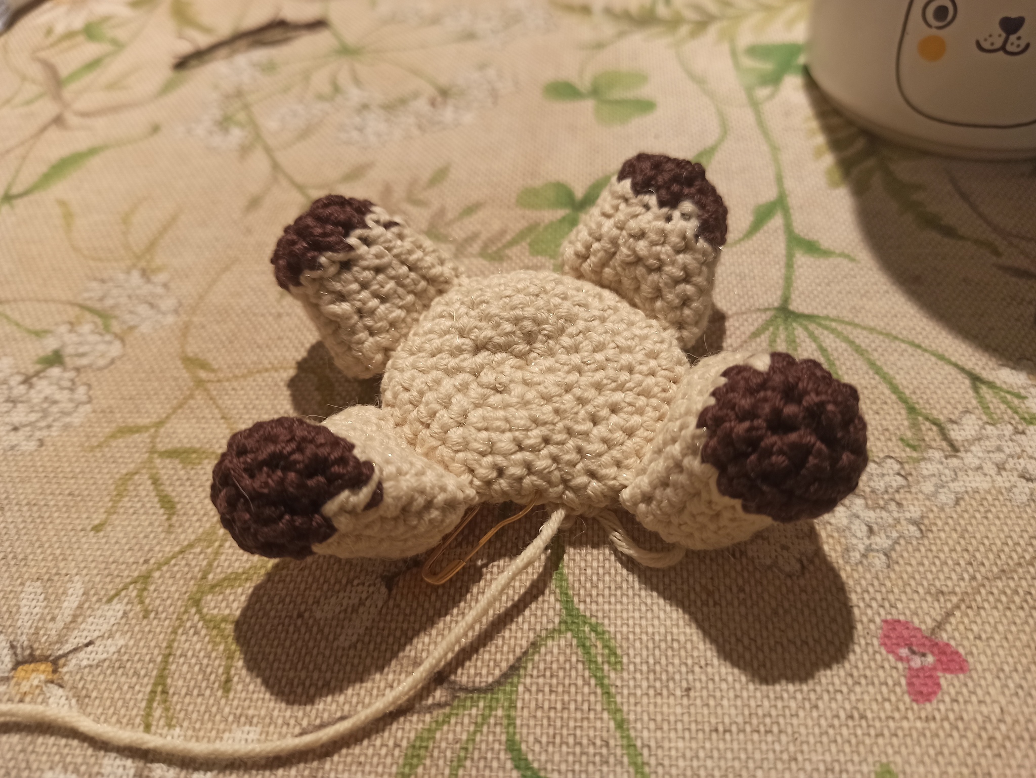 Хвост в бесплатной схеме был другой, его надо было делать из специальной мягкой шерсти, которая методом валяния прикреплялась к кончику. У меня специальных игл и шерсти в хозяйстве нет, потому хвостик простой метелочкой.