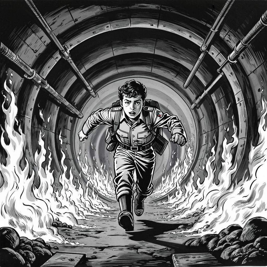 Освещение — в аварийный режим. Пол мигает. Панели оплавляются. Двери блокируются. Хорошо, что дым был тяжелым и теперь облаком стелился в ногах, больше не мешая дыханию.