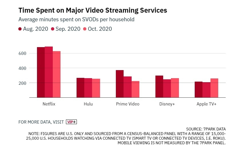 А еще Netflix за последние три месяца стал самым просматриваемым стриминговым сервисом!Он единственный из крупных сервисов, кому зрители в среднем уделяли 600 минут в месяц.